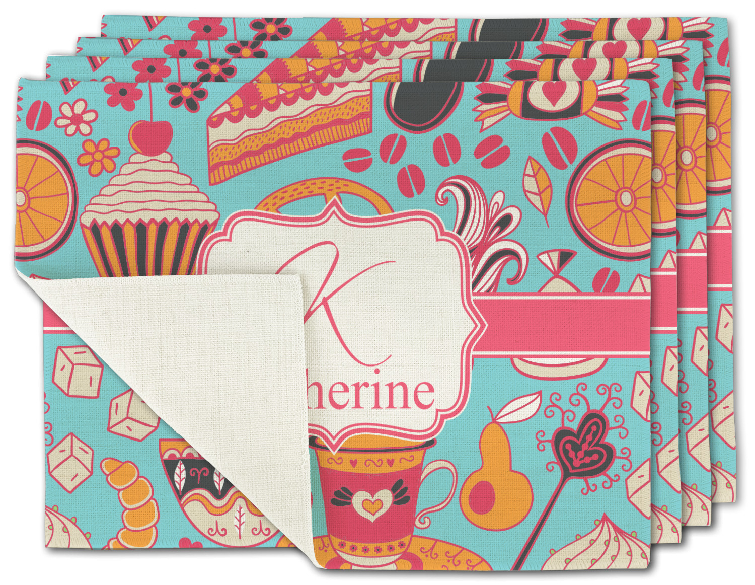Every woman knows, brunch is vital to happiness. And what's brunch without coffee and cupcakes and fruit? This upbeat design features all these beloved ingredients in bright oranges and pinks, set on a teal background.