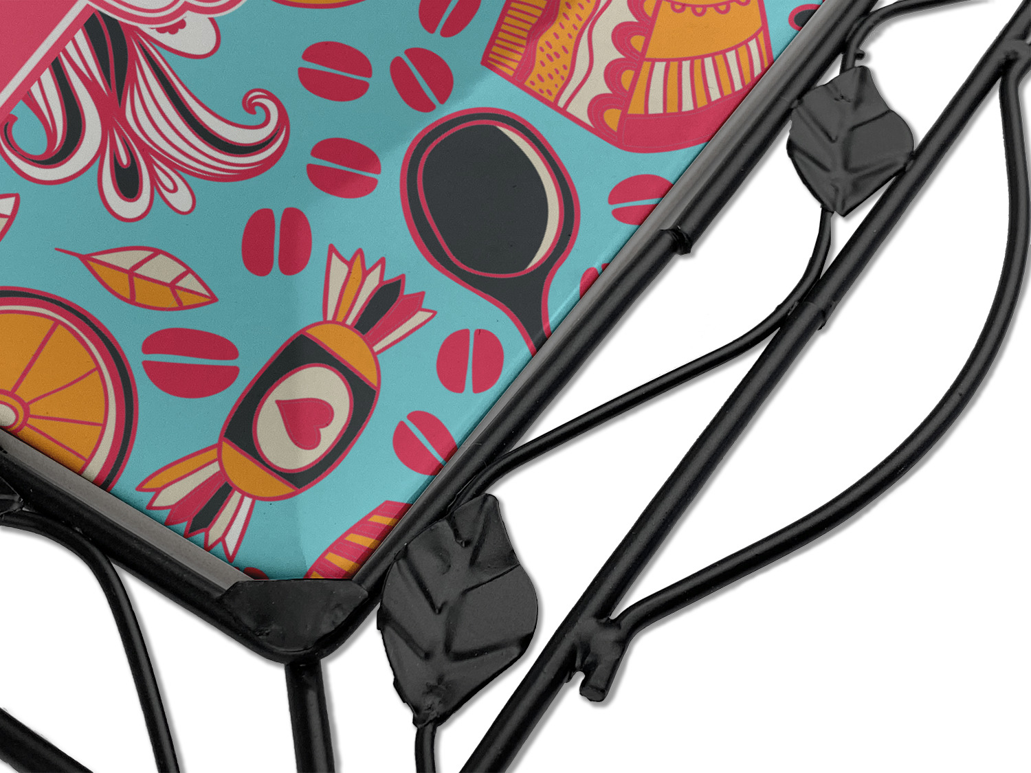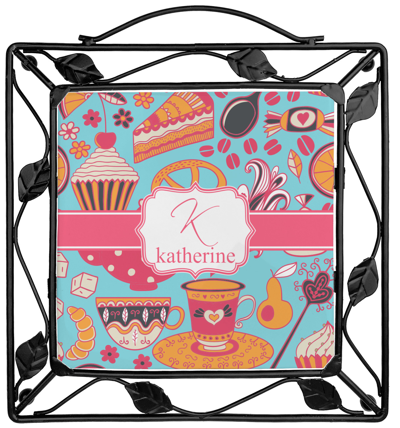 Our square trivets are made from a durable, wrought iron. This model features 4 small half circles, one on each corner, and a larger ring of iron that circles the central, customized tile. Each of the 4 corners has a round foot on its bottom for stability. This trivet is 8.75 by 8.75 inches, but the central tile measures at 6 inches on both sides.