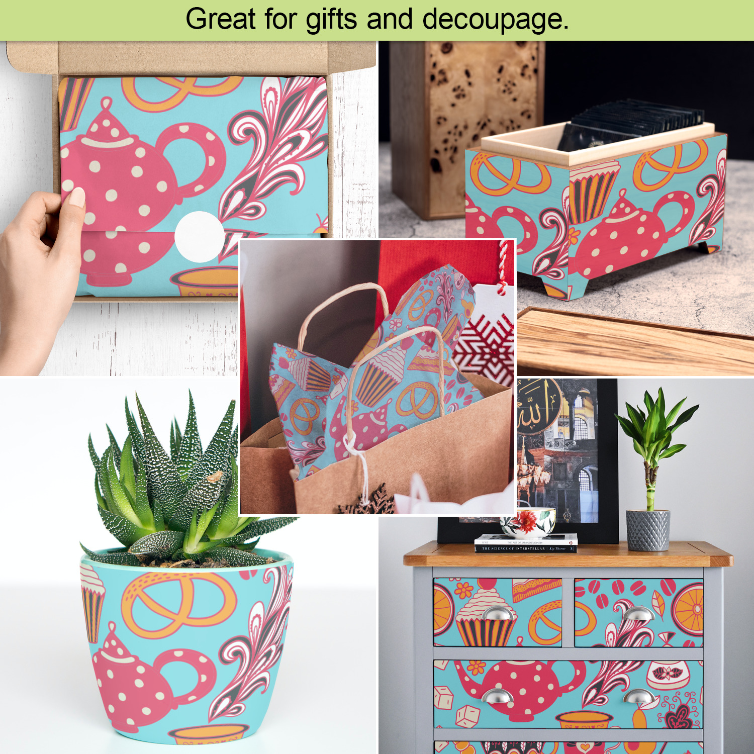 Our tissue paper sheets are also perfect for decoupage i.e. the art of gluing paper on ordinary objects to decorate them.