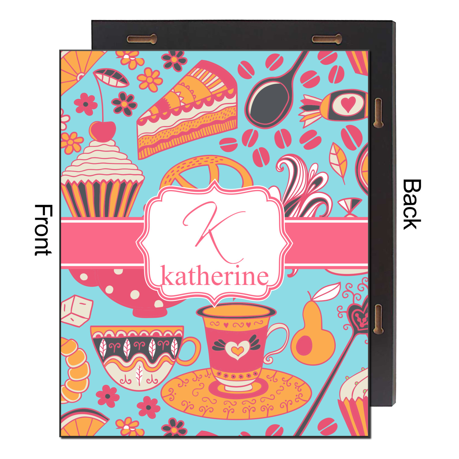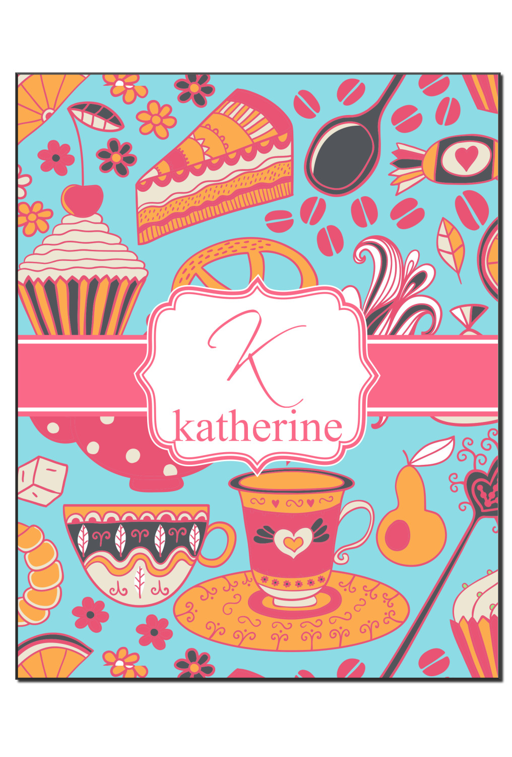 Every woman knows, brunch is vital to happiness. And what's brunch without coffee and cupcakes and fruit? This upbeat design features all these beloved ingredients in bright oranges and pinks, set on a teal background.