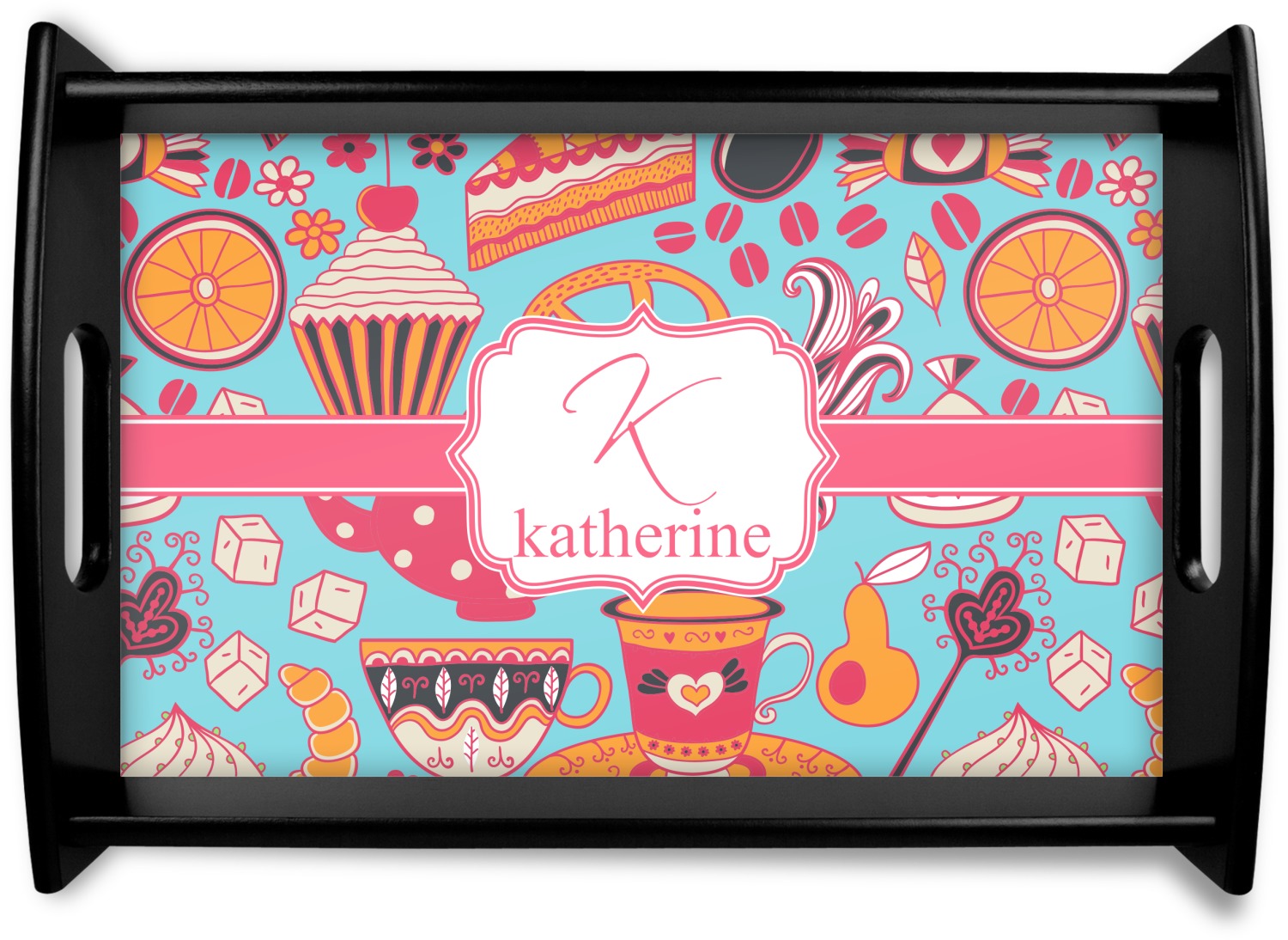 Every woman knows, brunch is vital to happiness. And what's brunch without coffee and cupcakes and fruit? This upbeat design features all these beloved ingredients in bright oranges and pinks, set on a teal background.