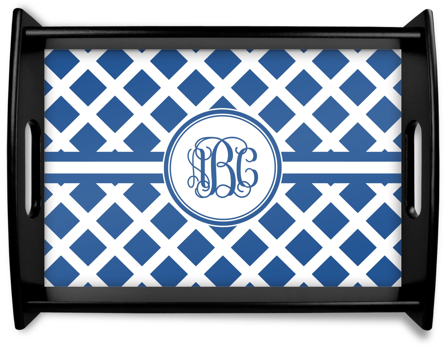 This serving tray with handles features square edges and two rounded sides, creating a very modern look. Each side is fabricated from a beautifully cut, natural wood. The bottom of the interior of the tray displays your customized design in bright, vibrant color. The tray is sold in both a black color and a natural wood look. Each variation of the wood serving tray has two sizes: Small, which is 14" x 10" x 2.25", and Large, which is 19.5" x 13.5" x 2.75".