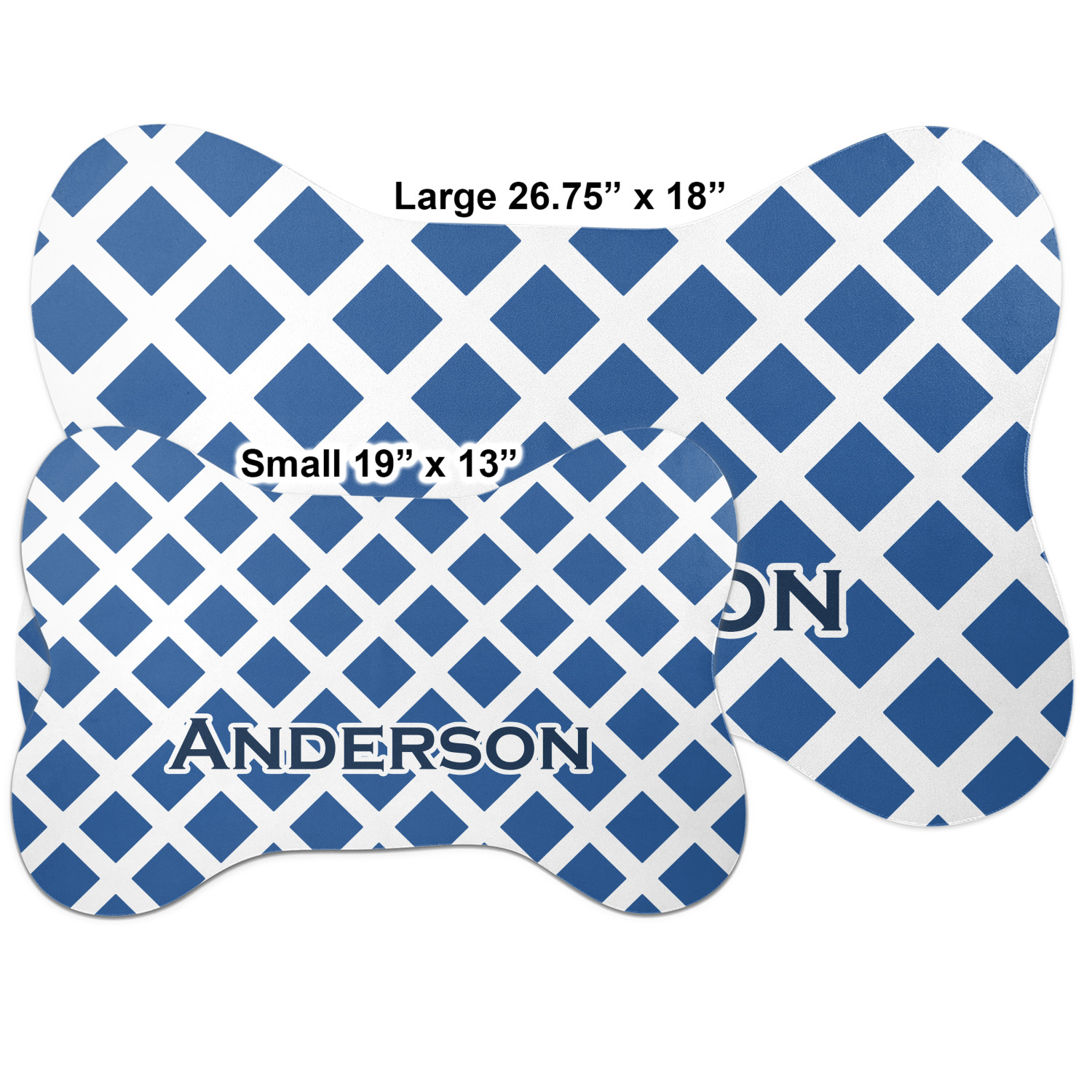 The top of this mat displays your custom design, as it is printed on polyester. To prevent slippage, the underside of the mat is made of rubber. We offer a small dog food mat, suitable for smaller dogs and a large dog food mat for bigger breeds. The small dog food mat is approximately 19 by 13 inches, while the large dog feeding mat measures at approximately 26.75 by 18 inches. Both personalized mats are ideally sized to fit two dog bowls.