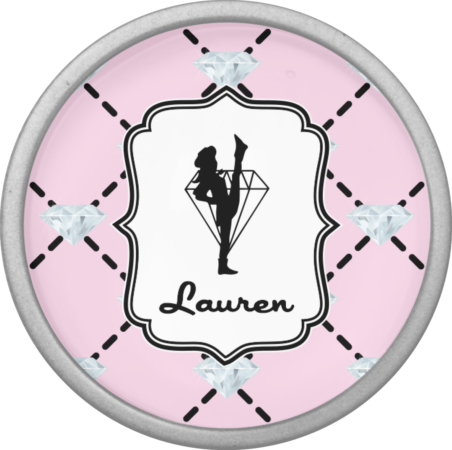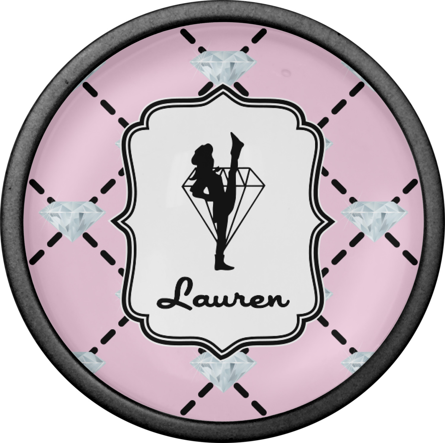 A beautiful decorative label showcases the silhouette of a dancer set inside a diamond personalized with the Diamond Drill team member's name.