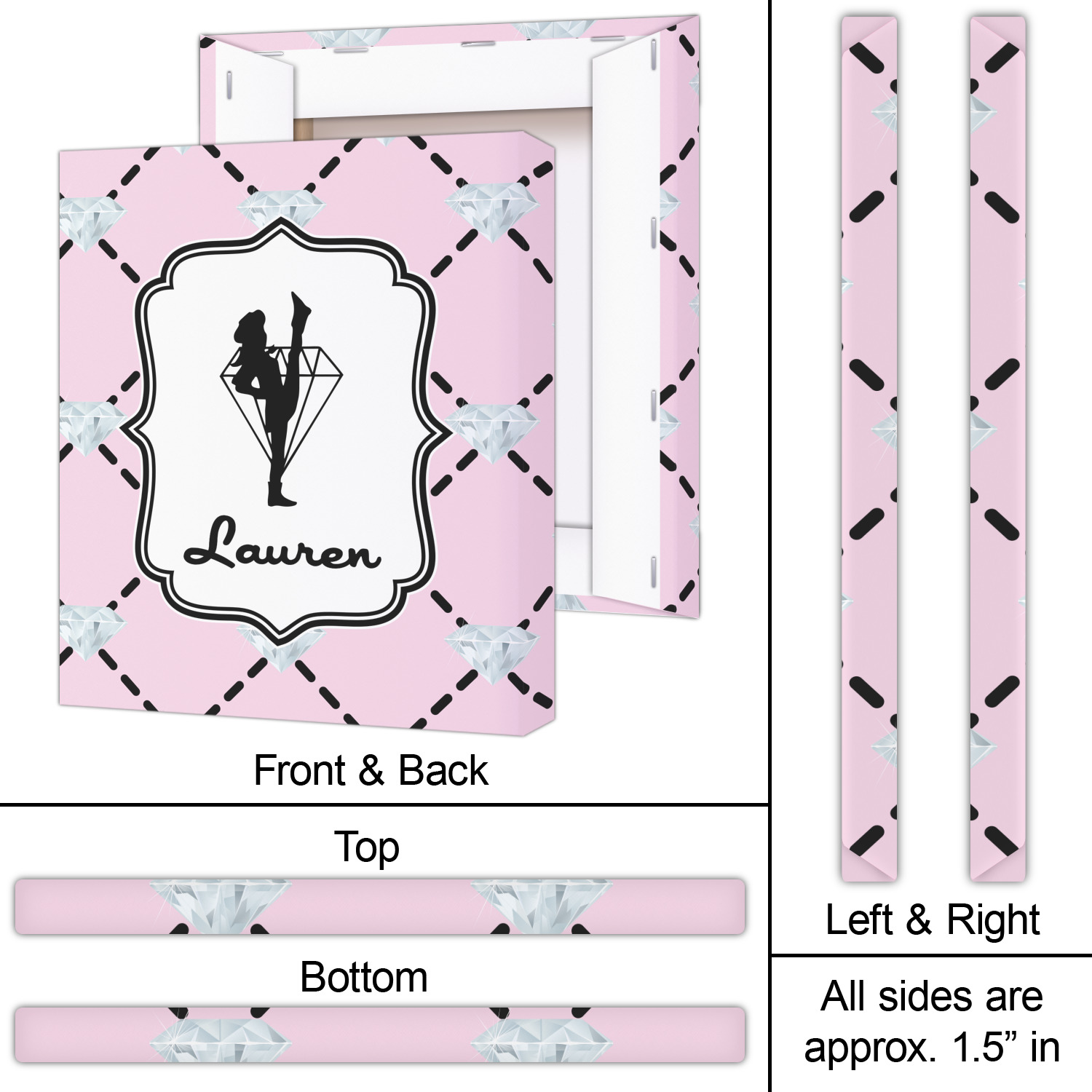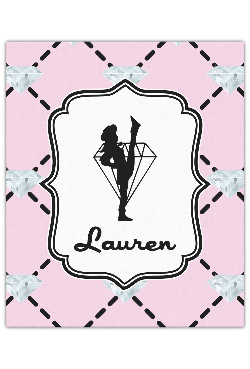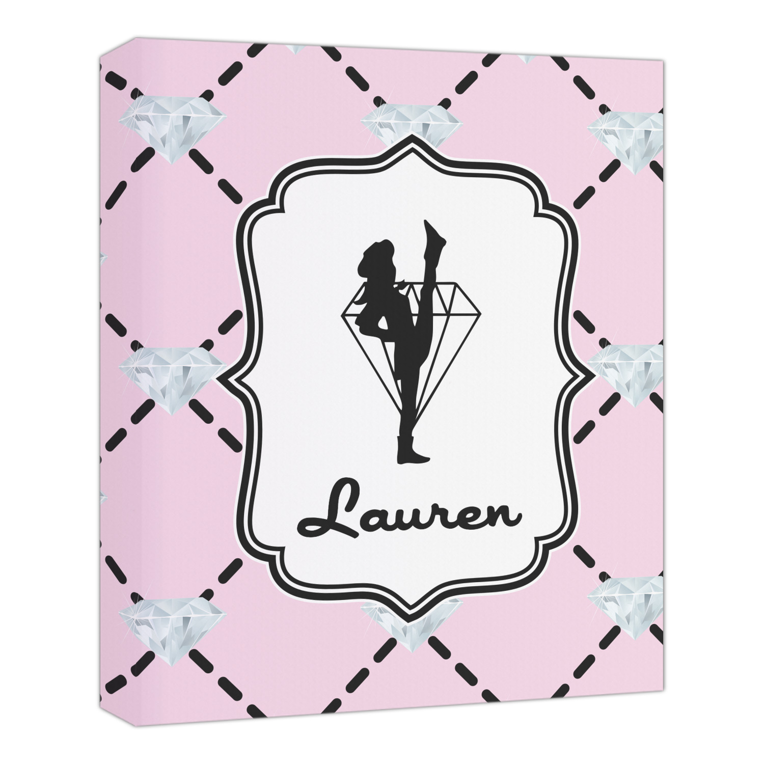 A beautiful decorative label showcases the silhouette of a dancer set inside a diamond personalized with the Diamond Drill team member's name.