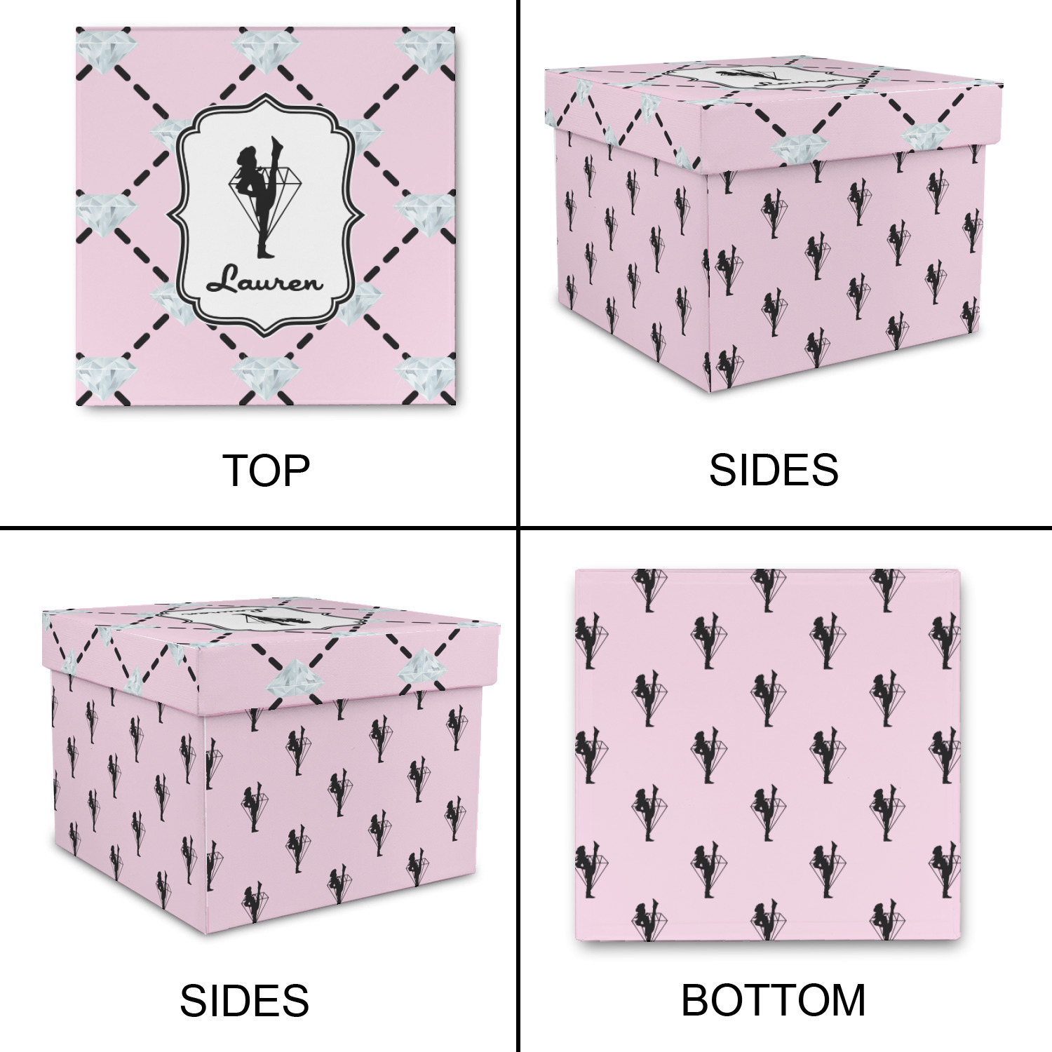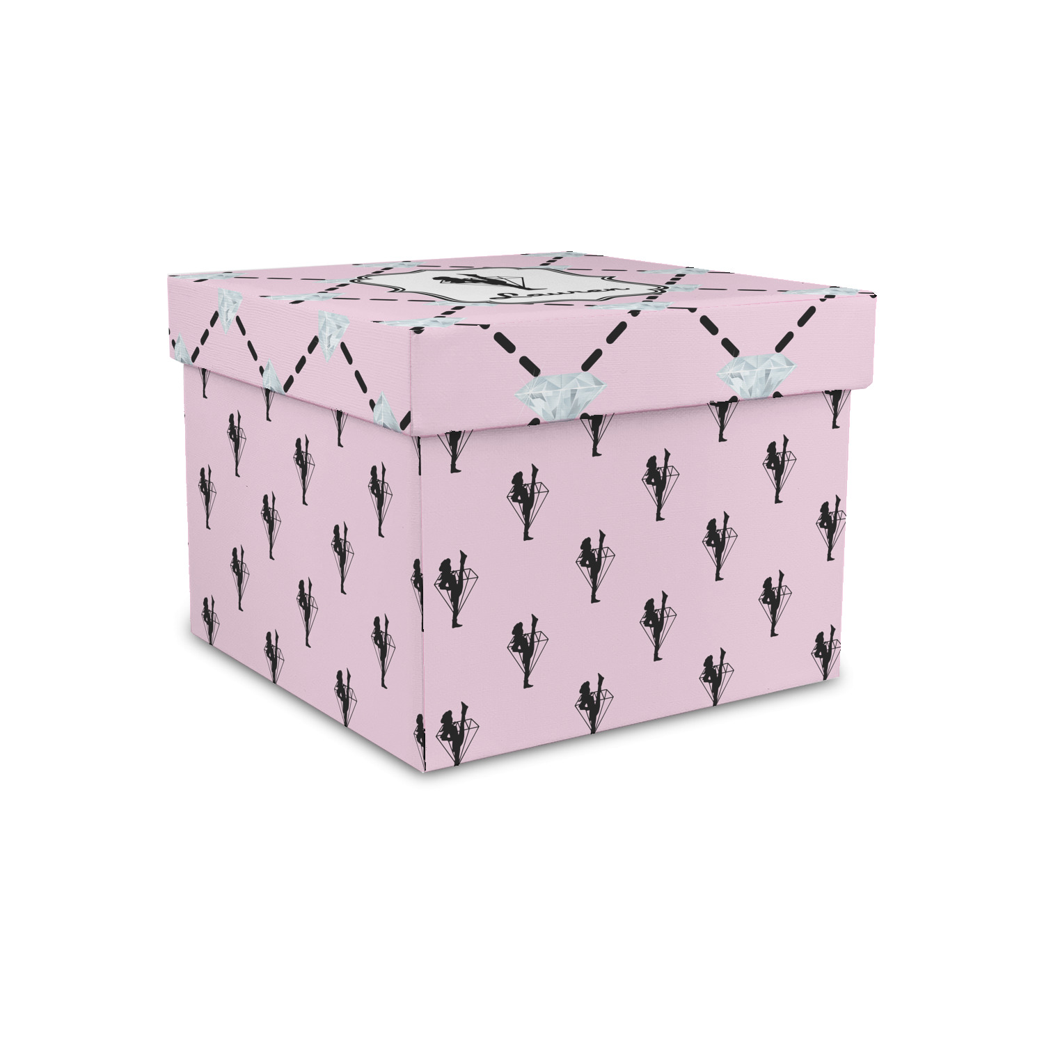A beautiful decorative label showcases the silhouette of a dancer set inside a diamond personalized with the Diamond Drill team member's name.