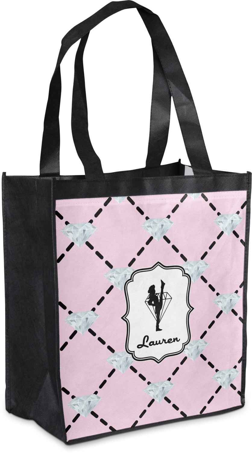 Made from a durable, biodegradable material, these reusable shopping bags can support up to 30 pounds of weight. With two large handles, measuring at 8.5 inches each, these personalized tote bags are easy to carry to your vehicle or home. The bag itself is 12 by 13.5 inches, and can expand to a depth of 7 inches. Your customization is printed on both the front and back, while the remaining sides, trim, and handle are a sleek, charcoal black.