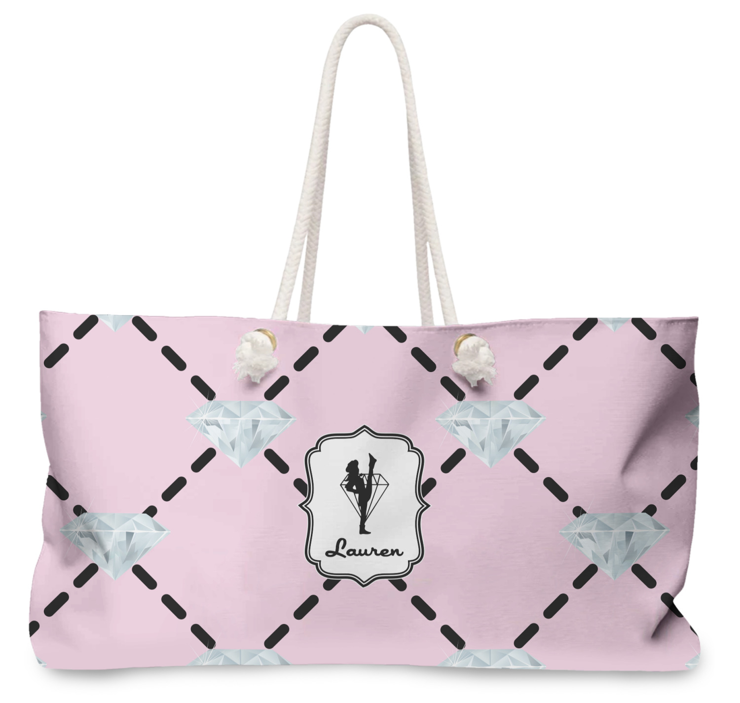 Our oversized weekender tote with rope handles is perfect for your weekend at the beach or on the town. This large tote are 24" W X 13" H, with a 5" gusset and a 27" thick rope handles with a knot that is put through a grommeted brass hole.