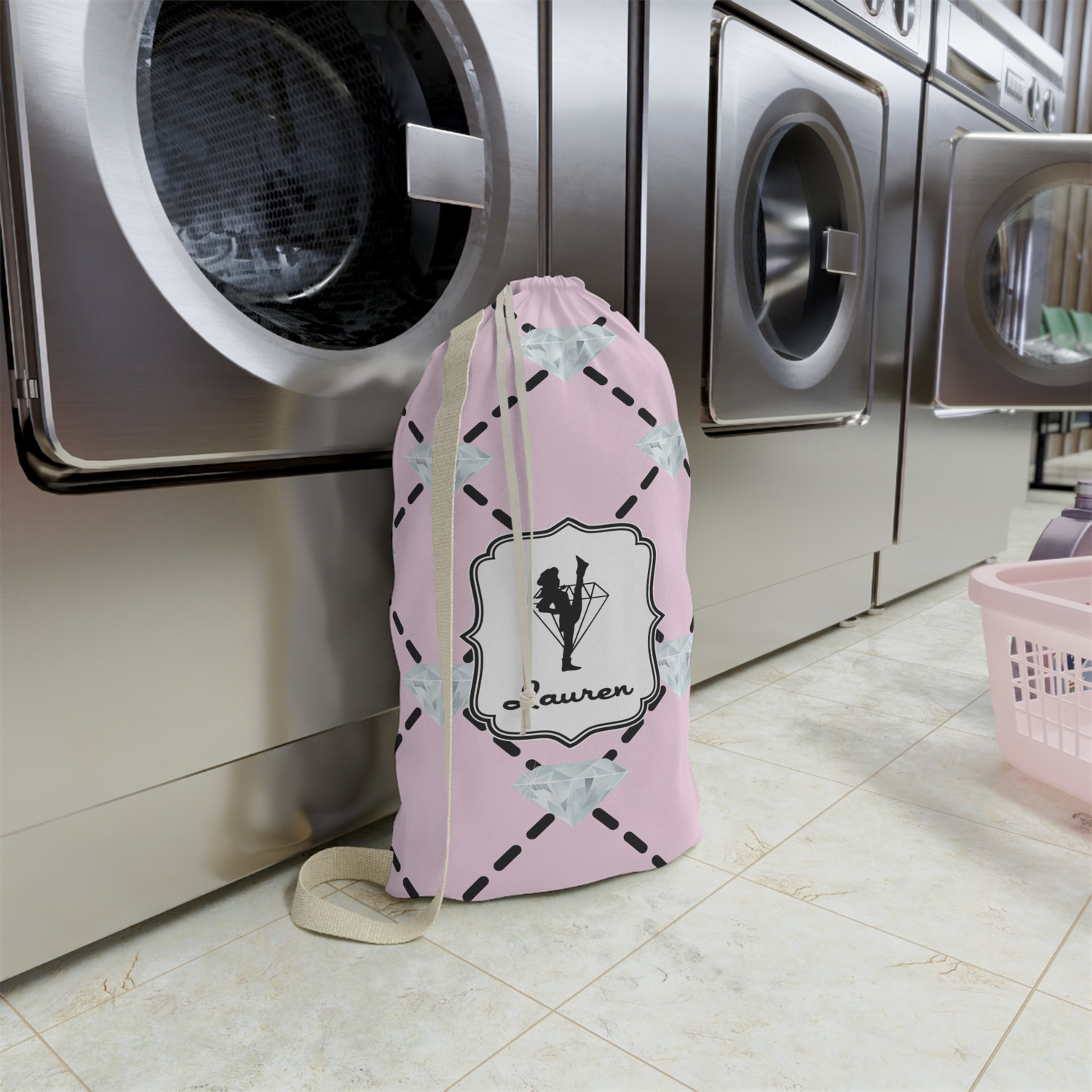 Carry your laundry in style with these customized laundry bags. Available in two sizes, featuring a natural colored woven strap and a cinch cord, these bags hold a lot of clothes or anything else you want to fit in them.