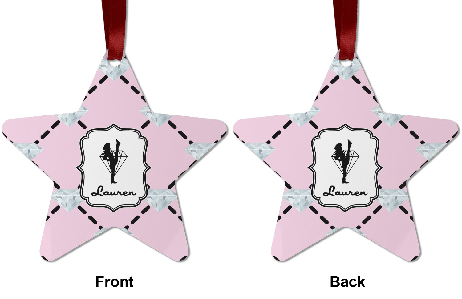 A beautiful decorative label showcases the silhouette of a dancer set inside a diamond personalized with the Diamond Drill team member's name.