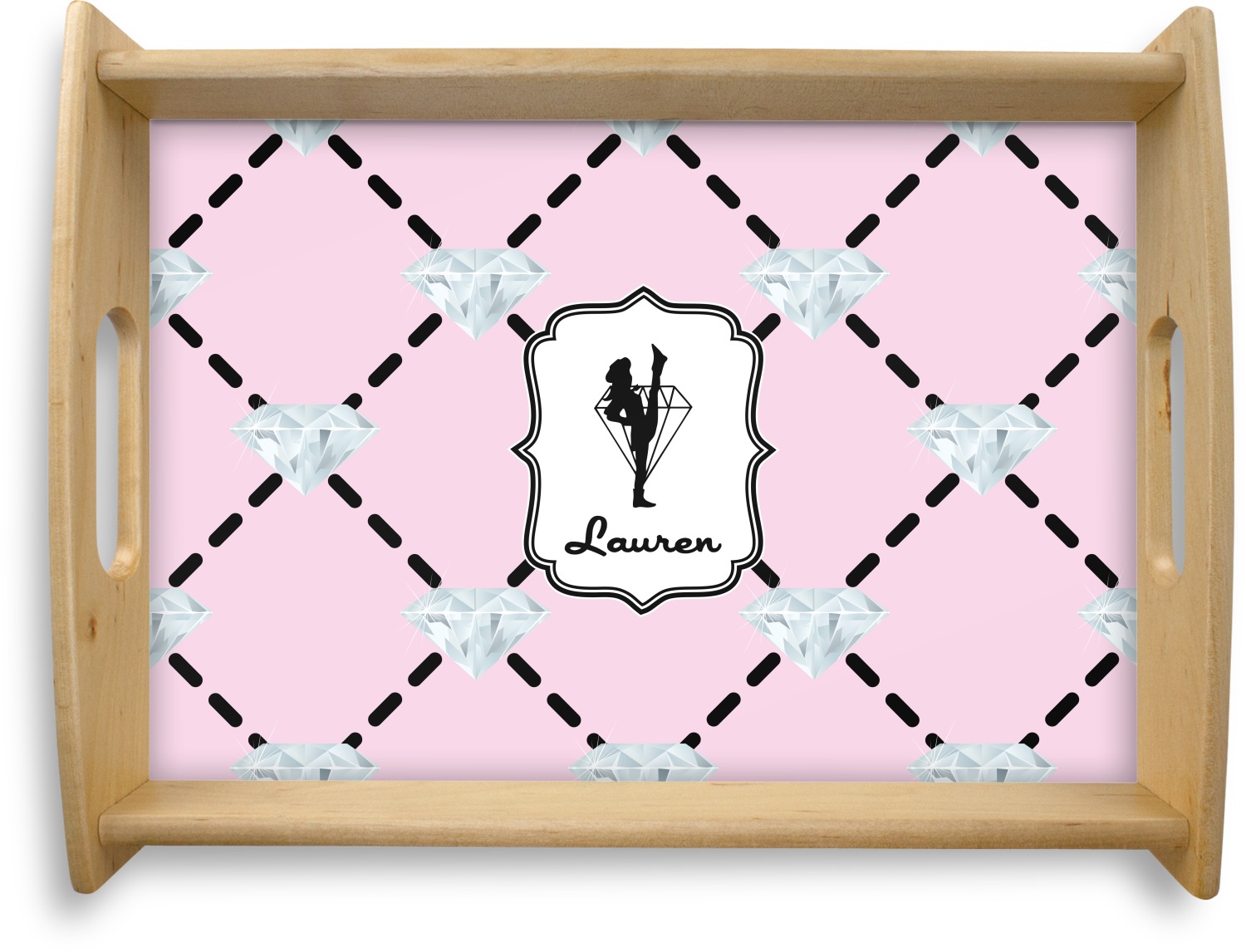 This serving tray with handles features square edges and two rounded sides, creating a very modern look. Each side is fabricated from a beautifully cut, natural wood. The bottom of the interior of the tray displays your customized design in bright, vibrant color. The tray is sold in both a black color and a natural wood look. Each variation of the wood serving tray has two sizes: Small, which is 14" x 10" x 2.25", and Large, which is 19.5" x 13.5" x 2.75".