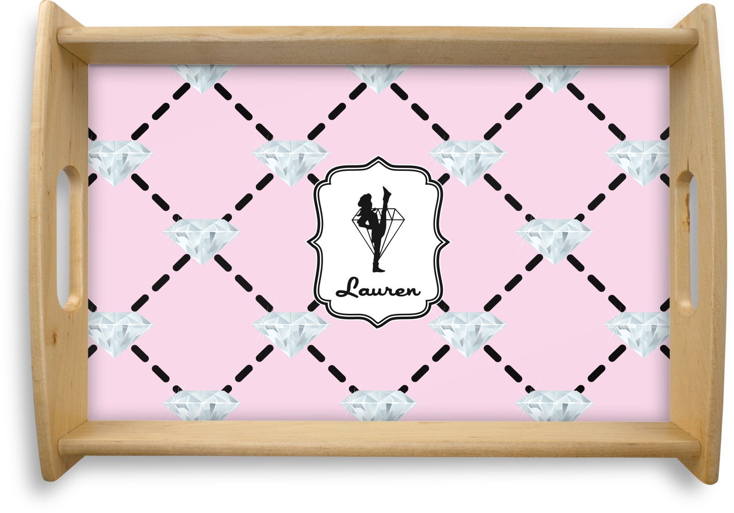 This serving tray with handles features square edges and two rounded sides, creating a very modern look. Each side is fabricated from a beautifully cut, natural wood. The bottom of the interior of the tray displays your customized design in bright, vibrant color. The tray is sold in both a black color and a natural wood look. Each variation of the wood serving tray has two sizes: Small, which is 14" x 10" x 2.25", and Large, which is 19.5" x 13.5" x 2.75".