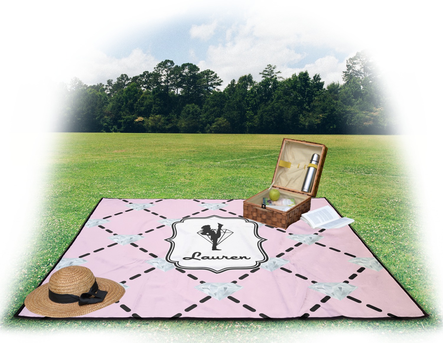 This picnic blanket is perfect for hanging out with your friends at the park or anywhere outside. The top of the blanket is made of a super soft microfiber fleece. The bottom of the blanket is made of a black material similar to a rain jacket and is water repellent as well. This will keep any wet spots on the ground from soaking through your picnic blanket. No one likes a wet blanket. The blanket measures at approximately 50" x 59" and has a nicely finished ribbon edge.