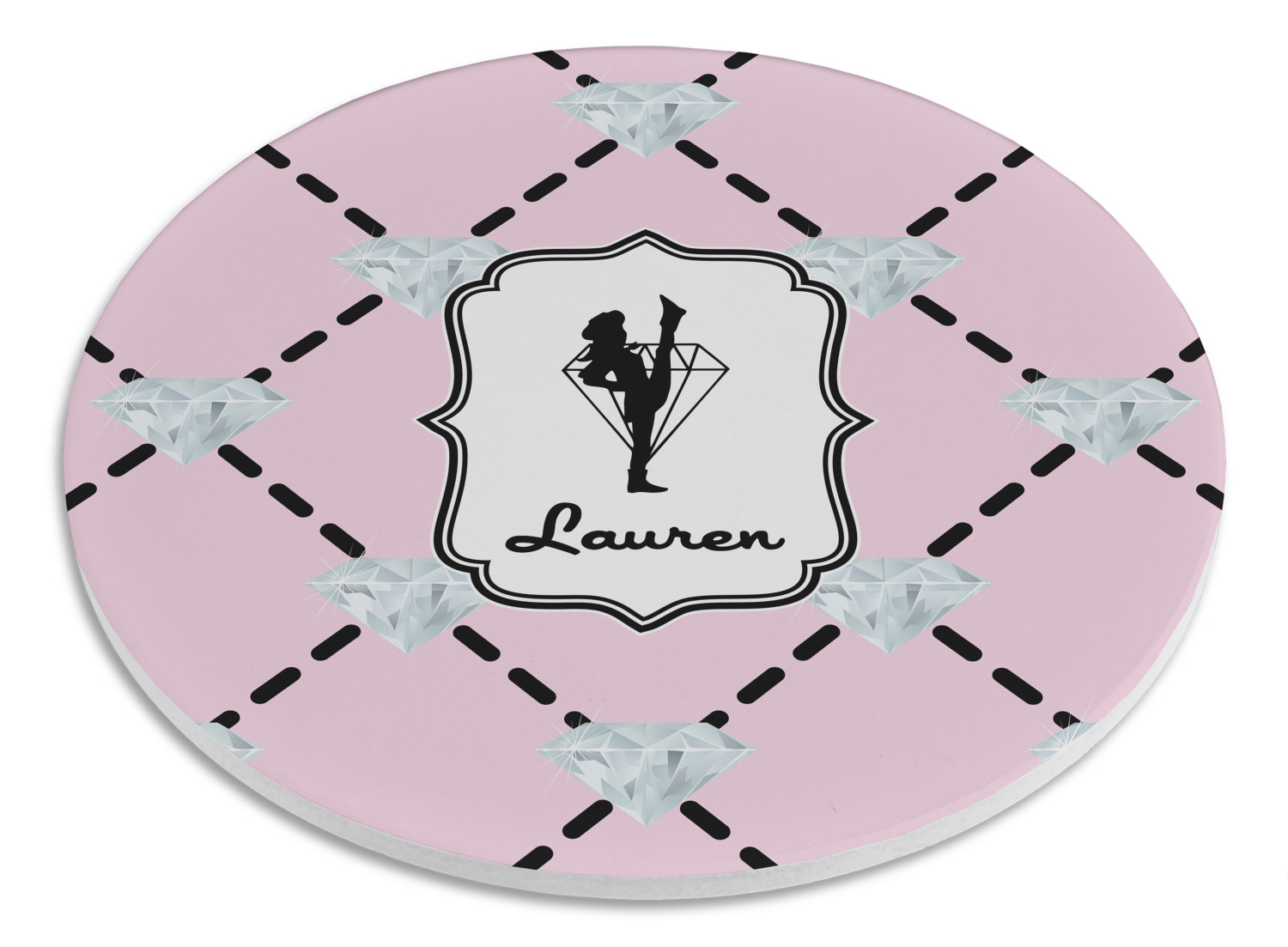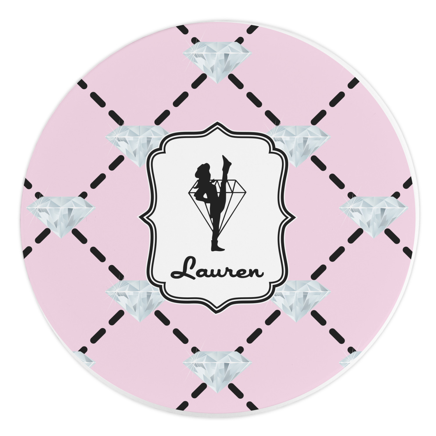 A beautiful decorative label showcases the silhouette of a dancer set inside a diamond personalized with the Diamond Drill team member's name.