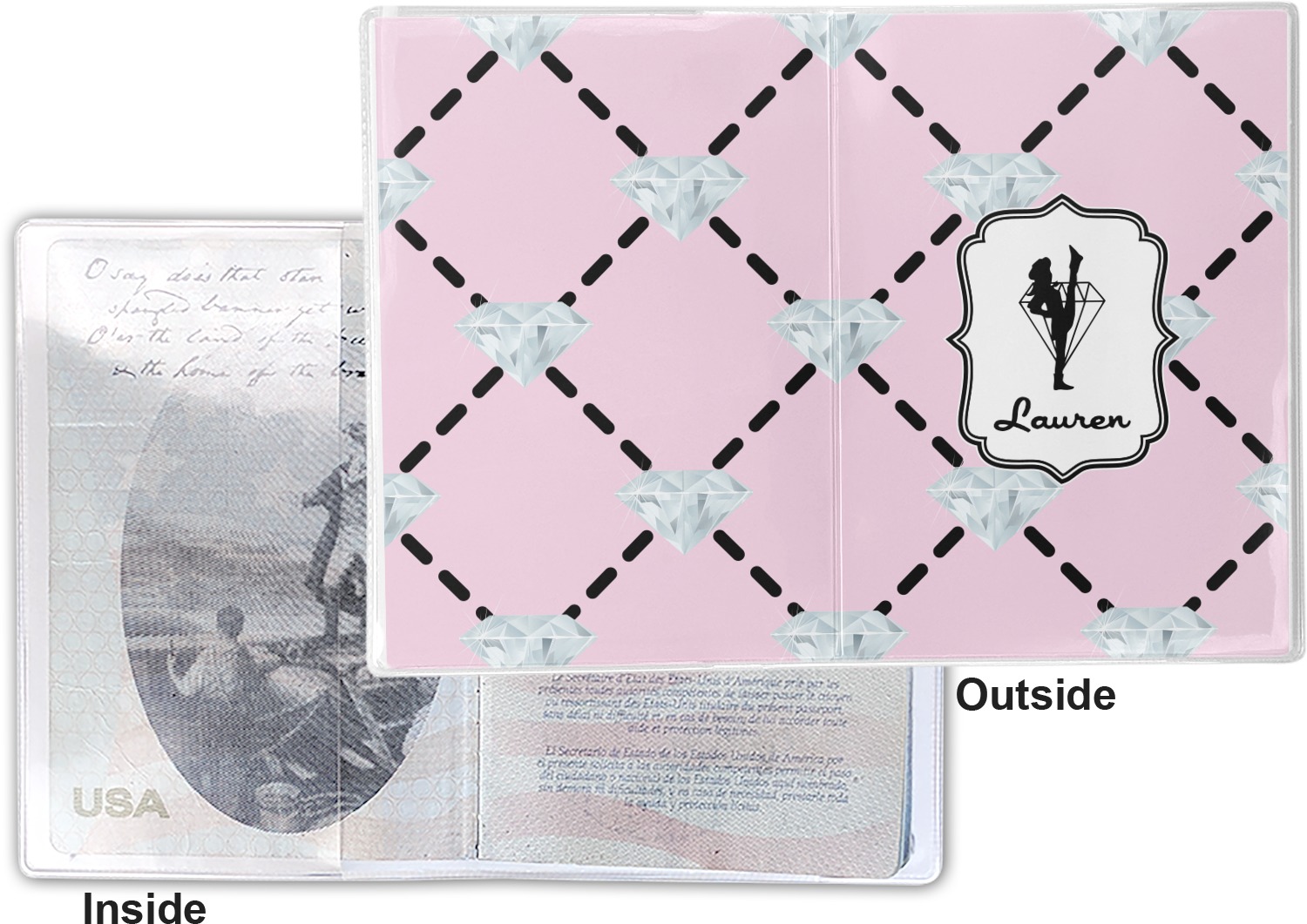 This cover is made of a sturdy clear vinyl with a personalized vinyl insert inside. There is a large and a small pocket on either side to hold the covers of your passport easily and firmly. The passport holder is approximately 7.5" x 5.25", the perfect size to snugly fit your passport. This slim cover is the perfect way to protect your passport without being one more bulky item you have to carry.