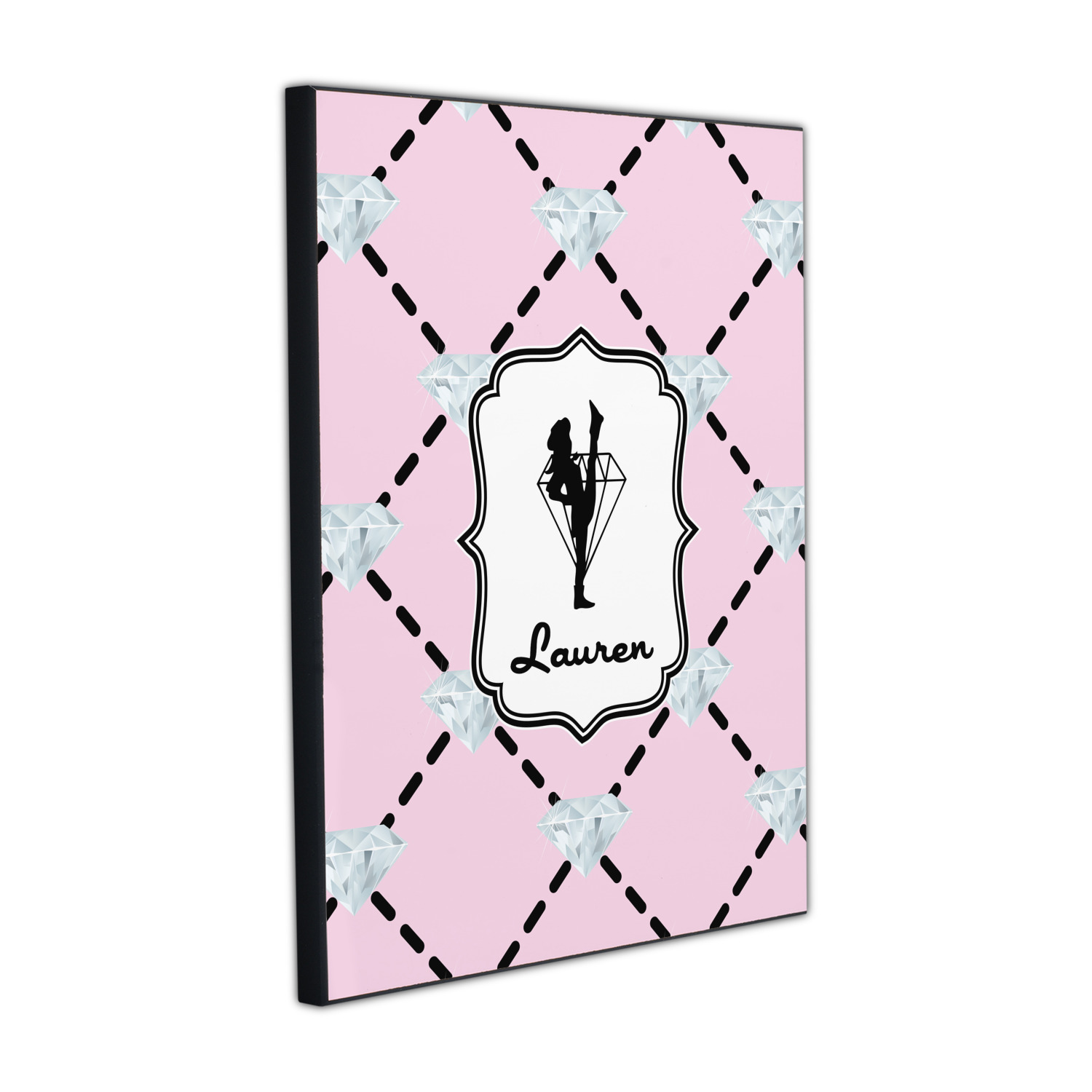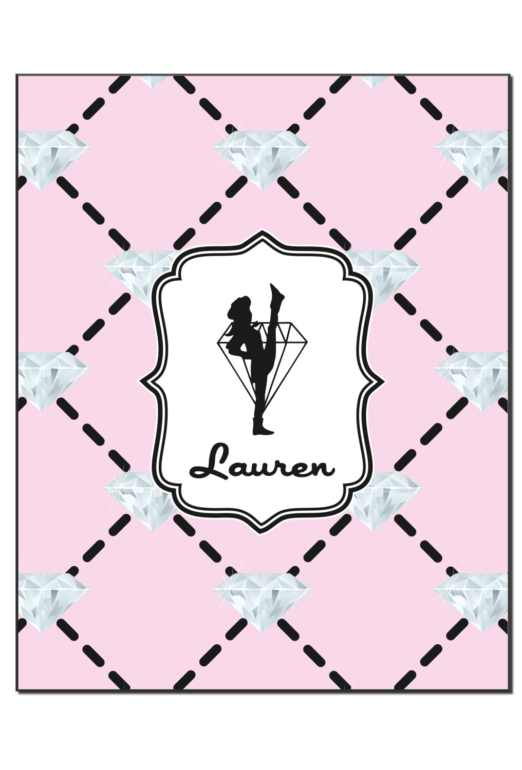 A beautiful decorative label showcases the silhouette of a dancer set inside a diamond personalized with the Diamond Drill team member's name.