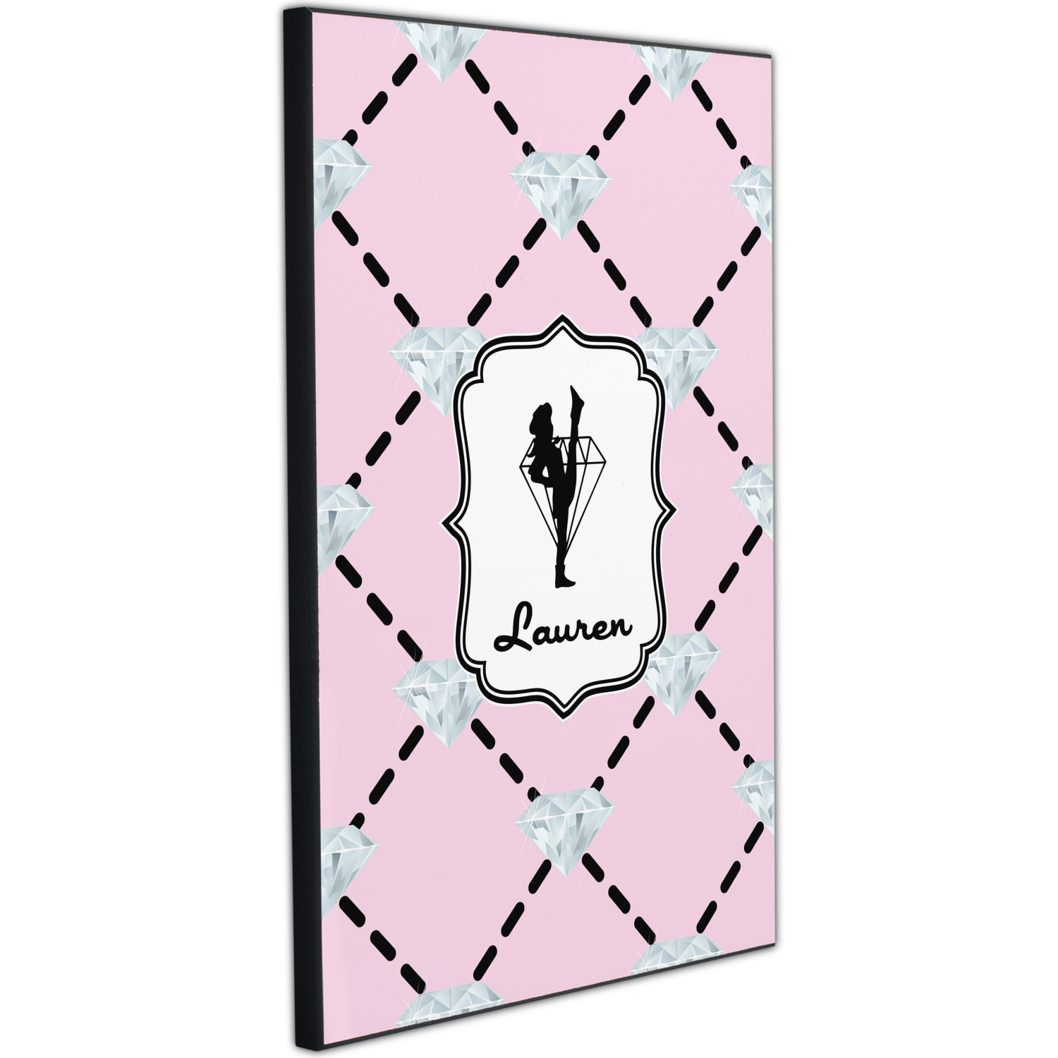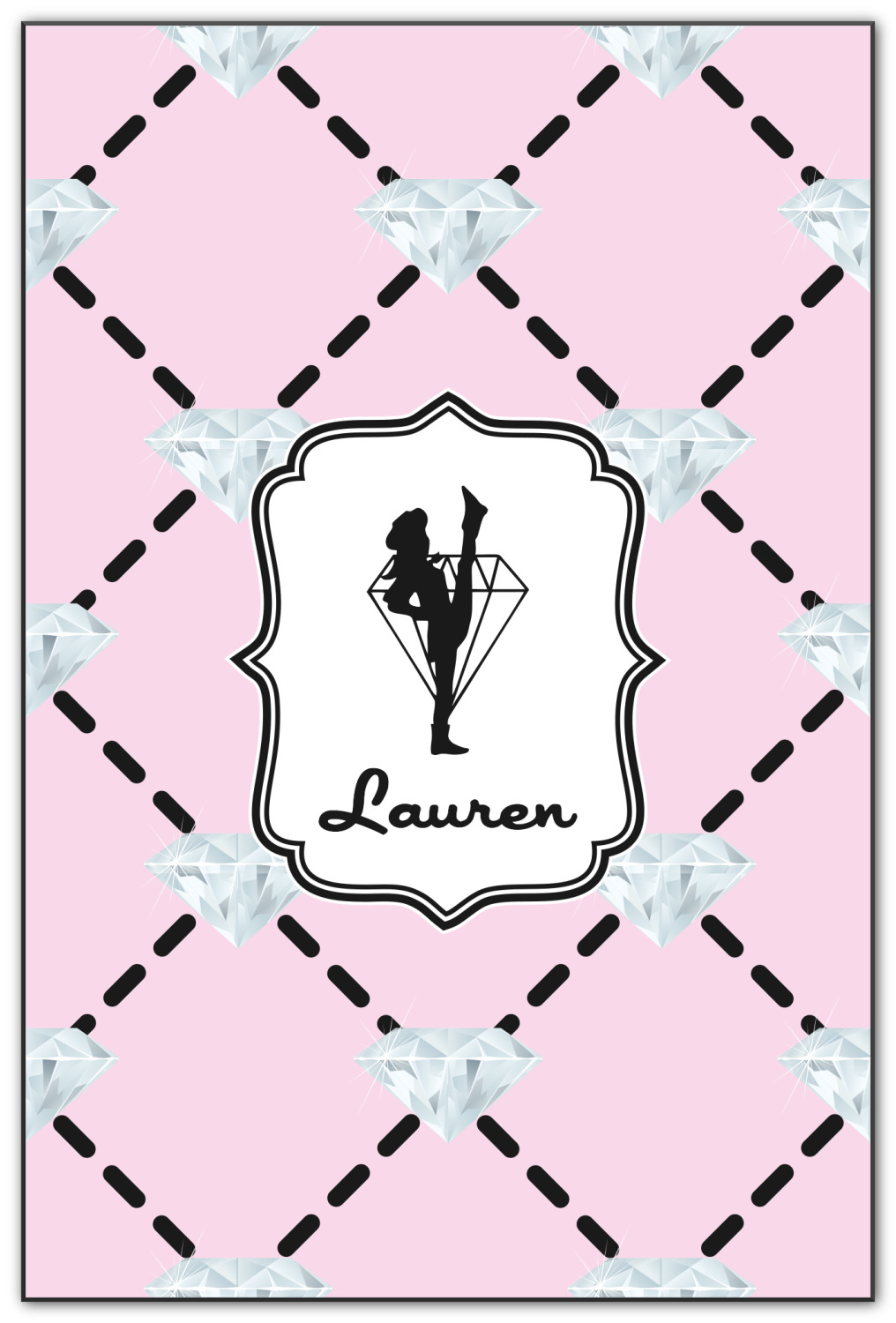 A beautiful decorative label showcases the silhouette of a dancer set inside a diamond personalized with the Diamond Drill team member's name.