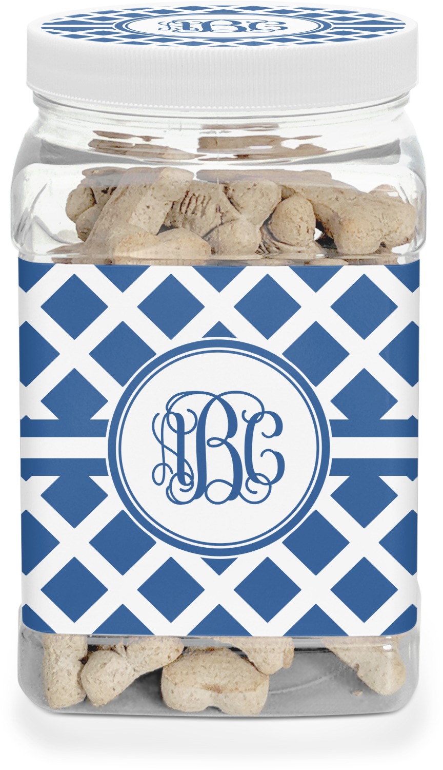 This half gallon jar, made from a sturdy plastic, is the perfect way to keep treats from any naughty pet paws, while still keeping them ready on hand for when your pup performs an impressive trick. This dog cookie jar features a screw-on, white lid that displays your personalized design on a vinyl sticker. We apply another customized sticker that wraps around the front and sides of the jar. Our dog treat jar also has indentations on the rear ends of the sides, which allows for convenient handling, and its square frame allows for easy storage.