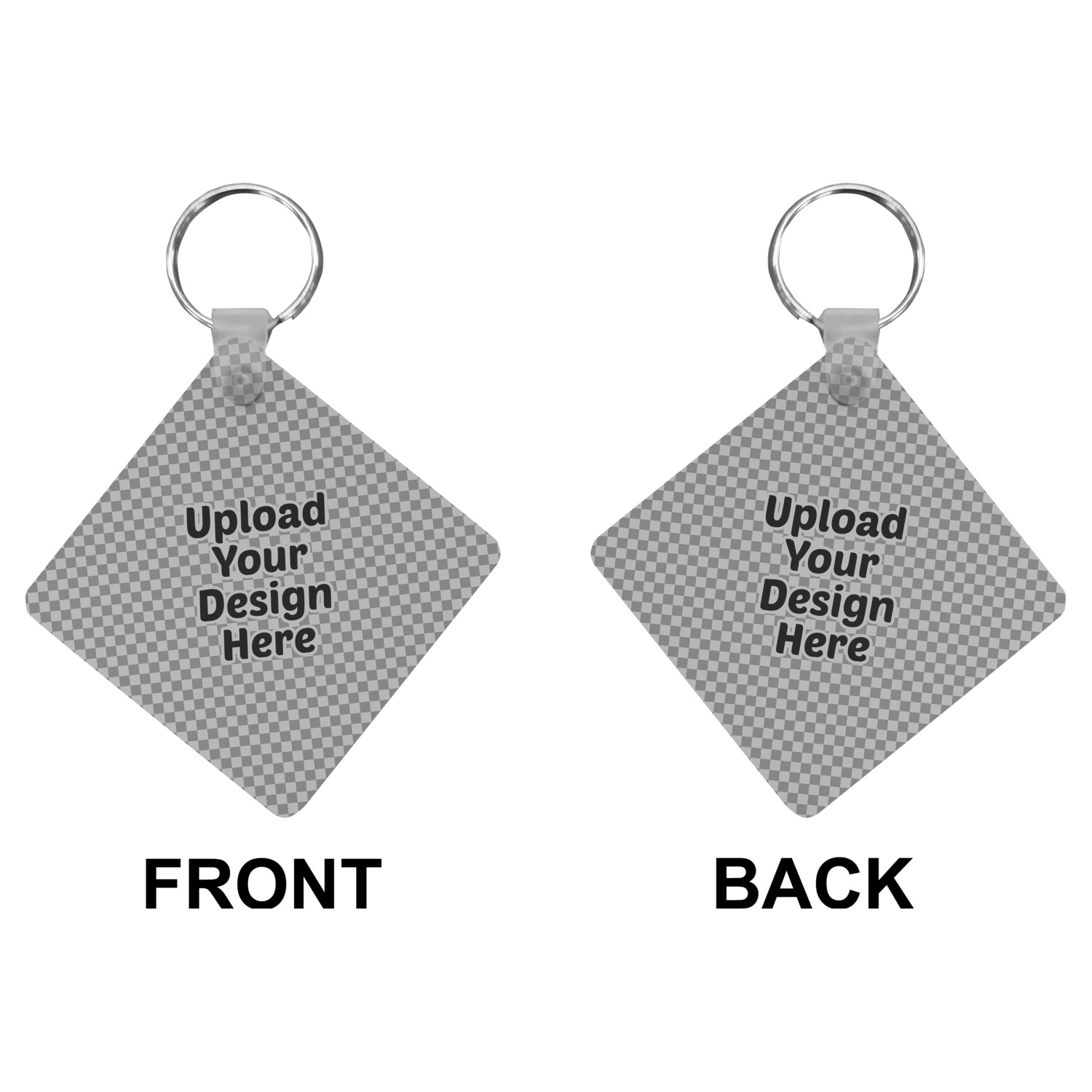 Our personalized keychains attach to the included metal, split key ring with a plastic, removable snap. Since a metal ring is included with your purchase, you have the liberty to keep your keys together on the ring, with or without your unique keychain. We offer this keychain in three different shapes: circle, heart, or diamond. We print your personalized design(s) on both sides of the key chain, and the surface has a glossy, reflective finish that only emphasizes your design. Each keychain is approximately 2.25 by 2.25 inches.