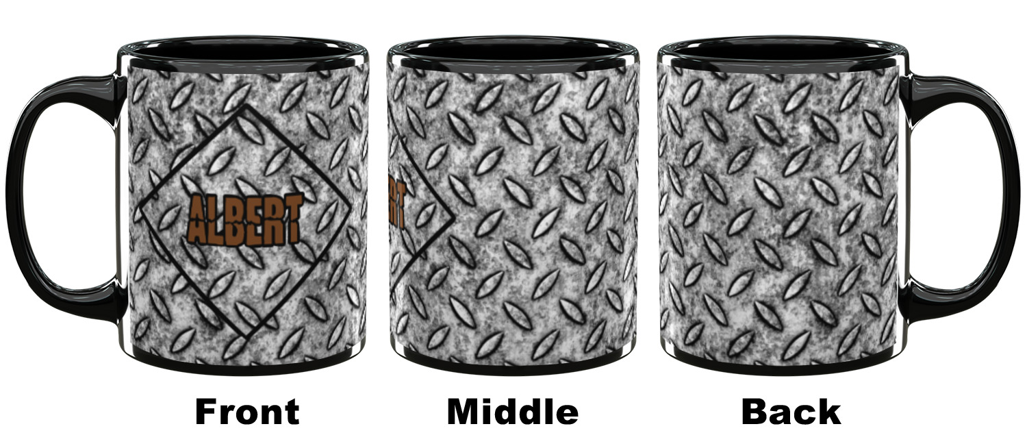 The design idea features a grungy diamond plate as the background. A diamond frame is the focal point of this design idea with your personalization in a grungy font. Nothing could get more manly than this.