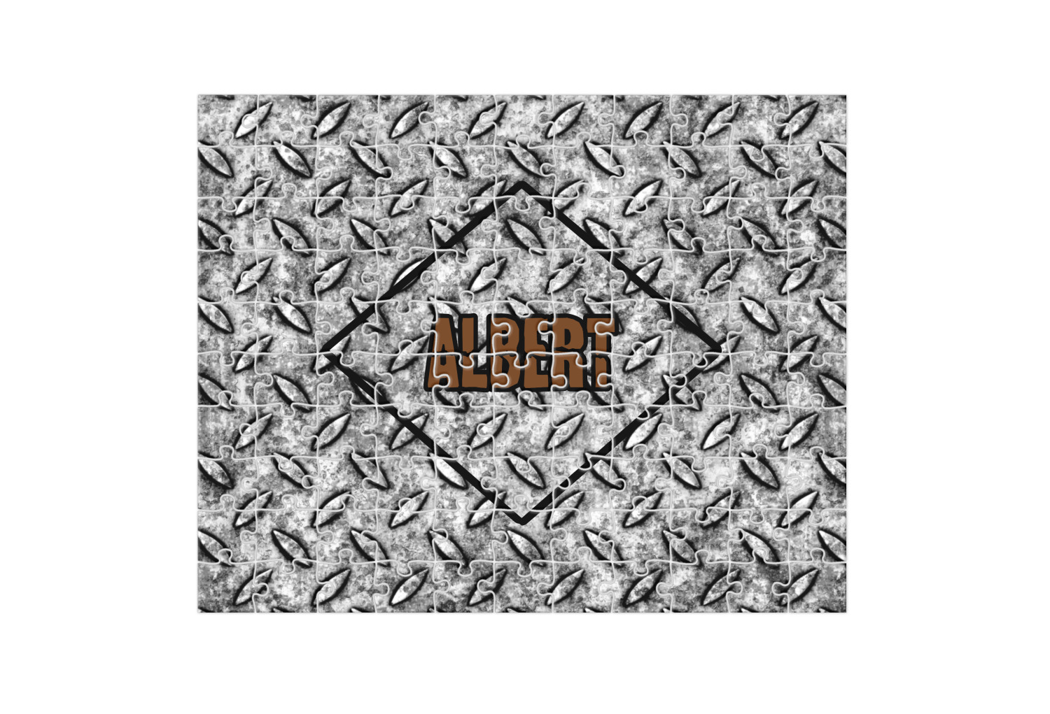 The design idea features a grungy diamond plate as the background. A diamond frame is the focal point of this design idea with your personalization in a grungy font. Nothing could get more manly than this.