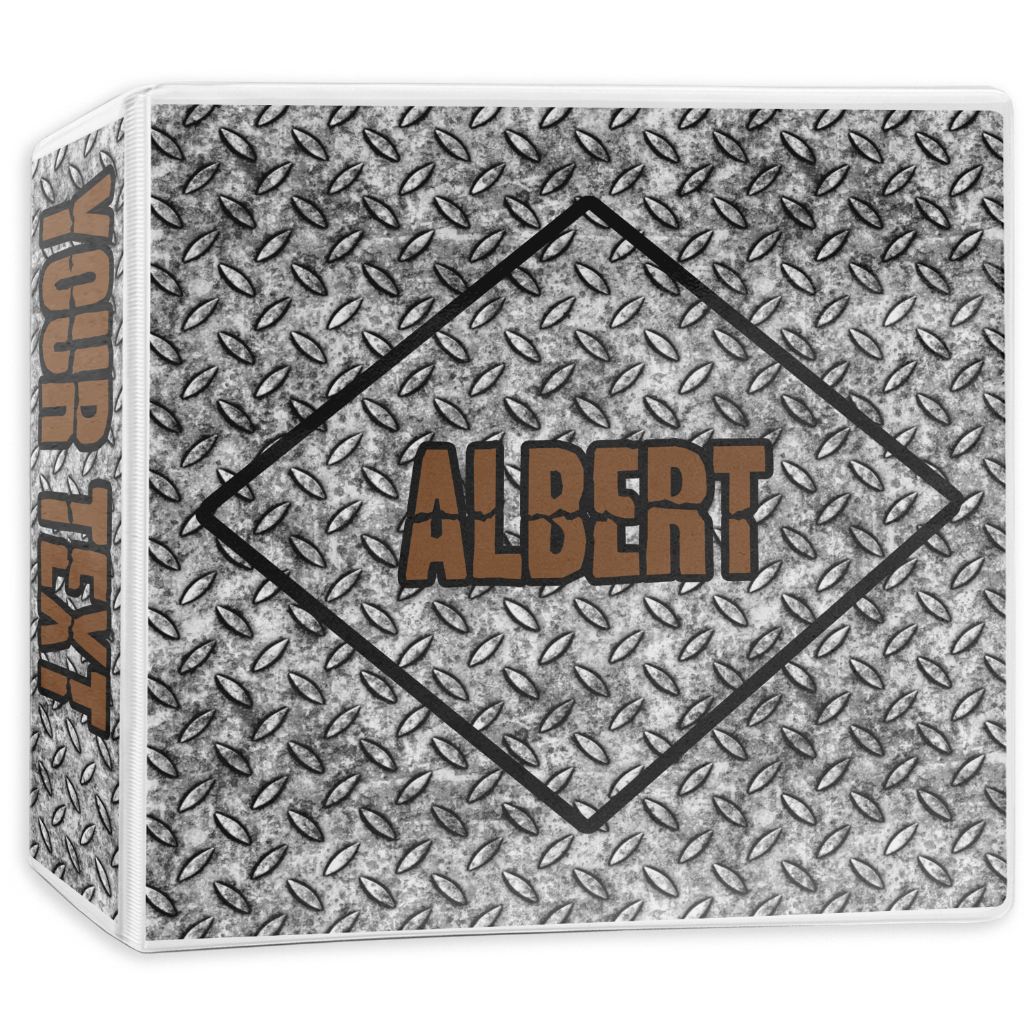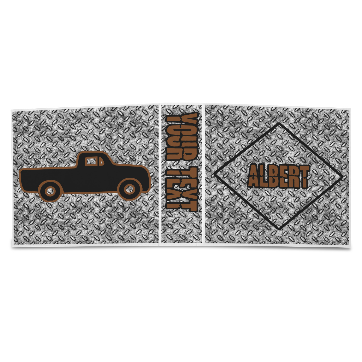 The design idea features a grungy diamond plate as the background. A diamond frame is the focal point of this design idea with your personalization in a grungy font. Nothing could get more manly than this.