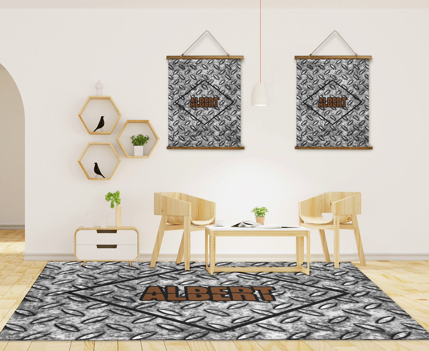 The design idea features a grungy diamond plate as the background. A diamond frame is the focal point of this design idea with your personalization in a grungy font. Nothing could get more manly than this.