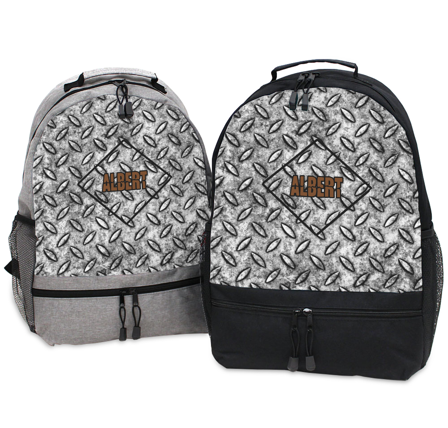 The design idea features a grungy diamond plate as the background. A diamond frame is the focal point of this design idea with your personalization in a grungy font. Nothing could get more manly than this.