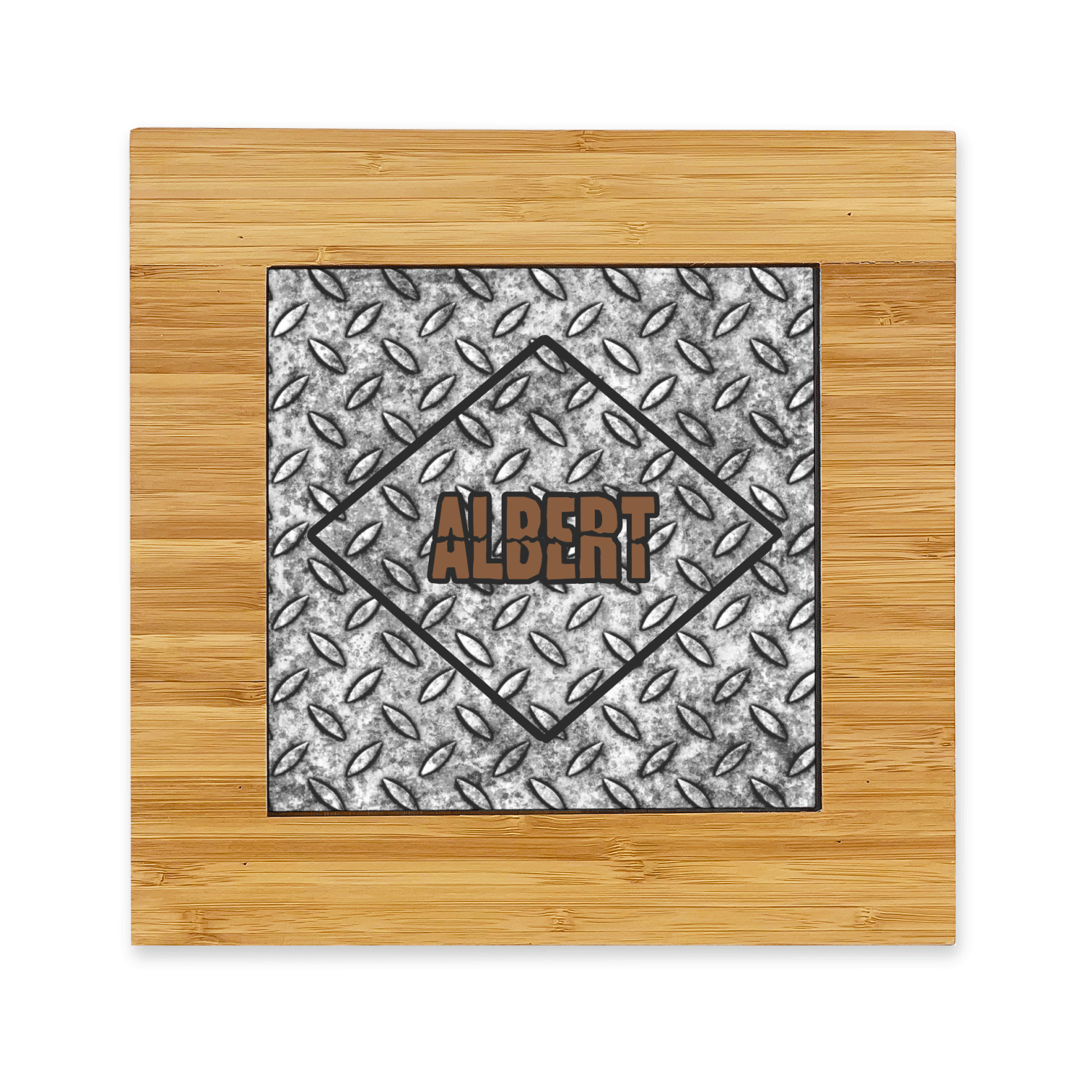 The design idea features a grungy diamond plate as the background. A diamond frame is the focal point of this design idea with your personalization in a grungy font. Nothing could get more manly than this.