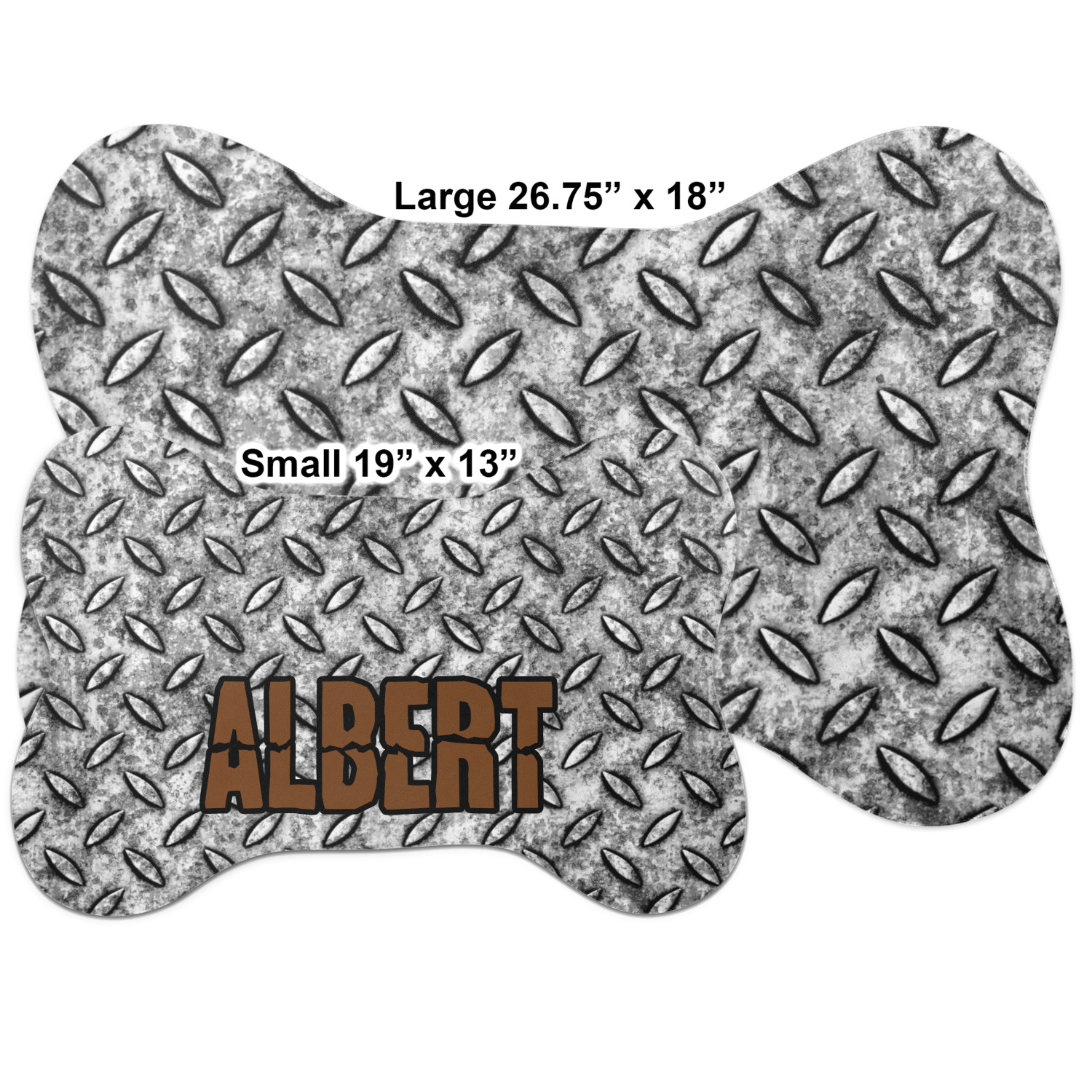 The top of this mat displays your custom design, as it is printed on polyester. To prevent slippage, the underside of the mat is made of rubber. We offer a small dog food mat, suitable for smaller dogs and a large dog food mat for bigger breeds. The small dog food mat is approximately 19 by 13 inches, while the large dog feeding mat measures at approximately 26.75 by 18 inches. Both personalized mats are ideally sized to fit two dog bowls.