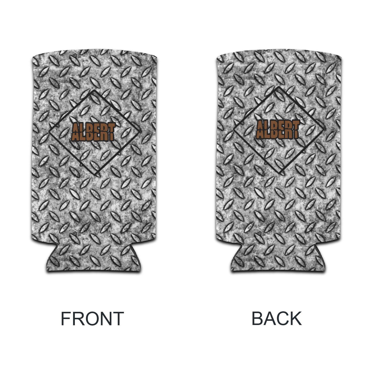 The design idea features a grungy diamond plate as the background. A diamond frame is the focal point of this design idea with your personalization in a grungy font. Nothing could get more manly than this.