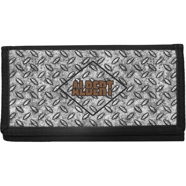 The design idea features a grungy diamond plate as the background. A diamond frame is the focal point of this design idea with your personalization in a grungy font. Nothing could get more manly than this.