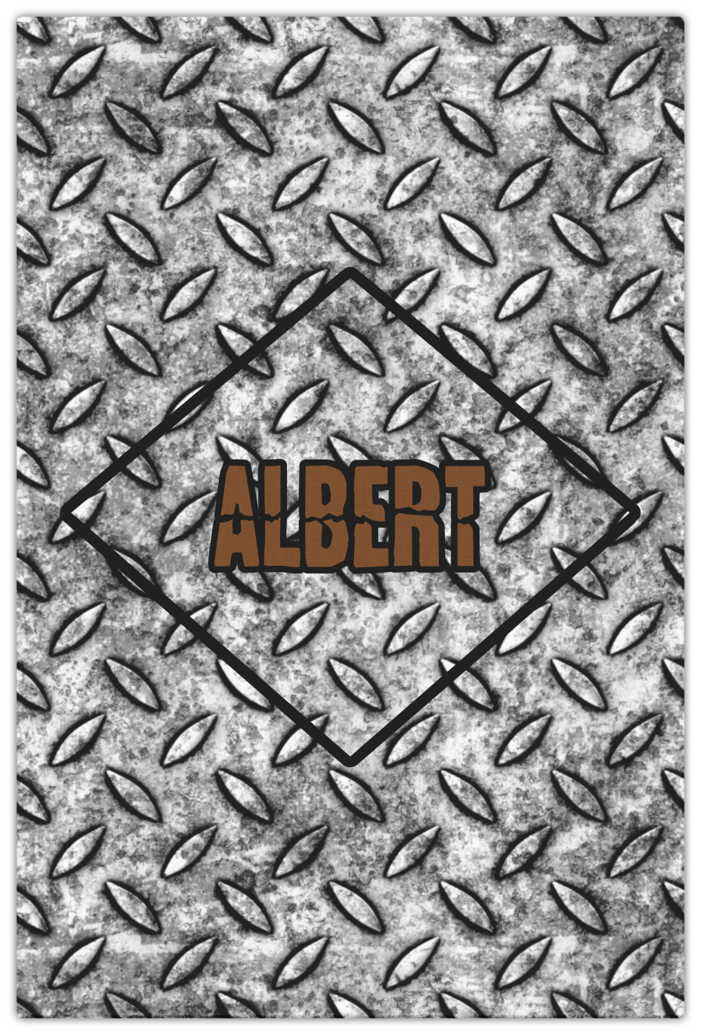The design idea features a grungy diamond plate as the background. A diamond frame is the focal point of this design idea with your personalization in a grungy font. Nothing could get more manly than this.