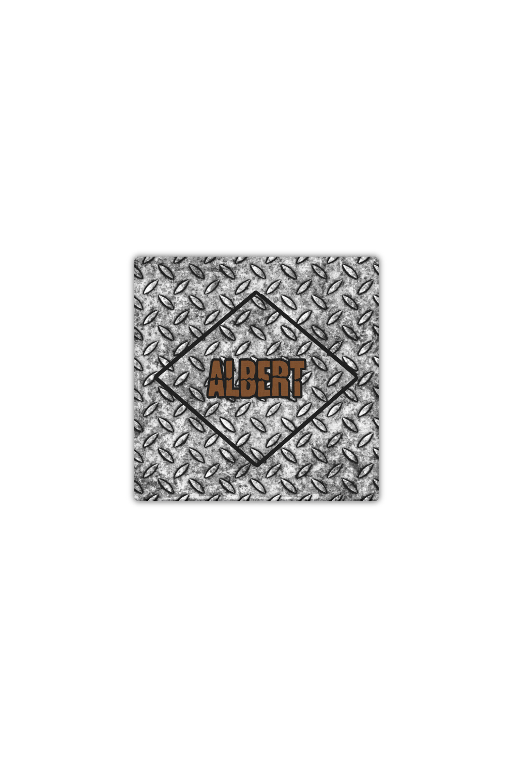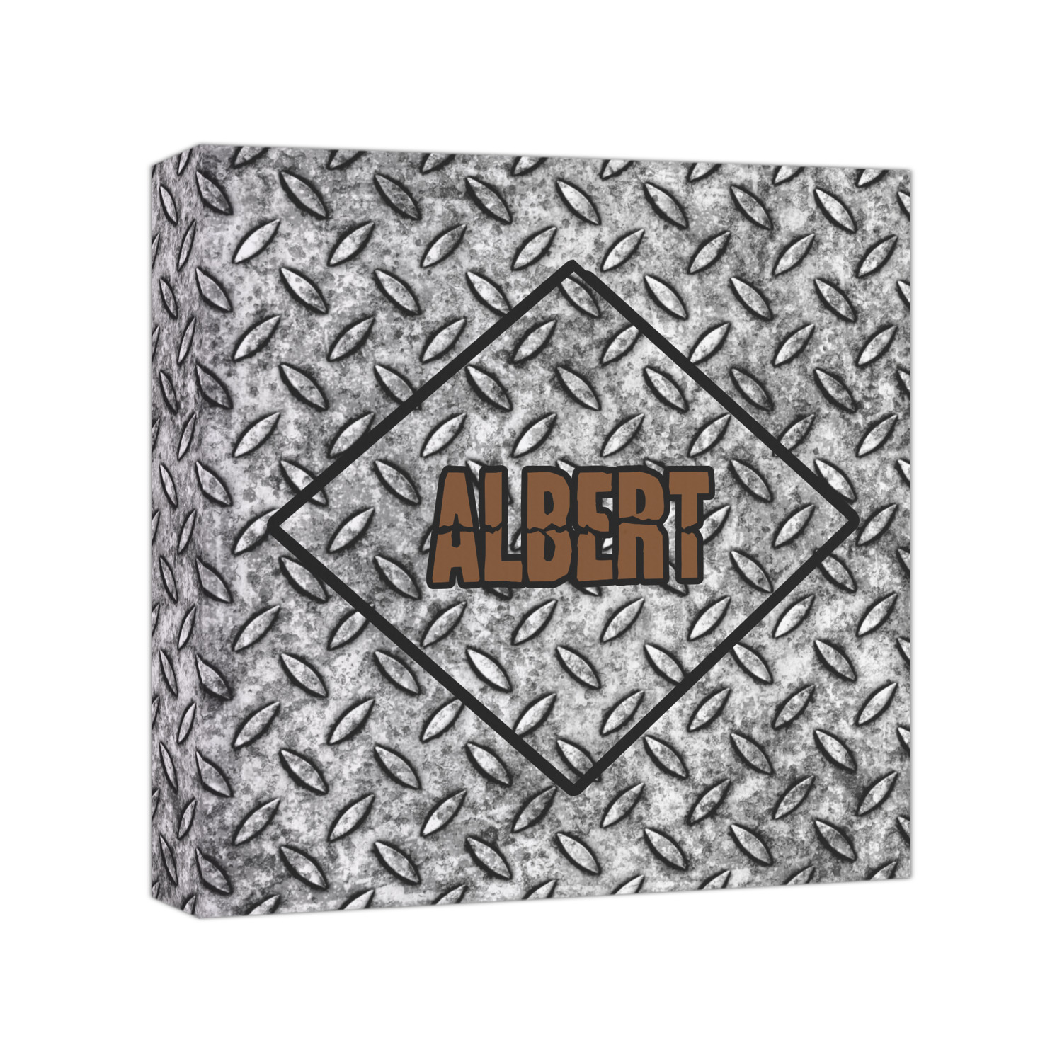 The design idea features a grungy diamond plate as the background. A diamond frame is the focal point of this design idea with your personalization in a grungy font. Nothing could get more manly than this.