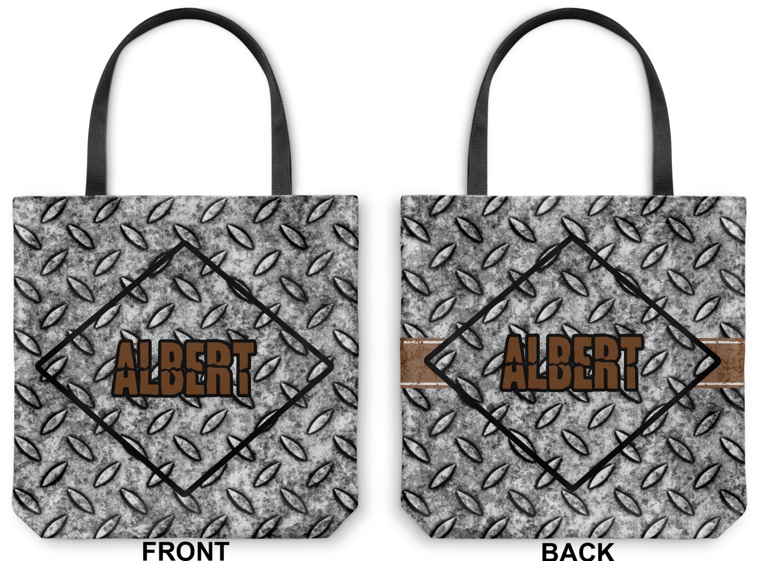 Our totes are made right here in the USA. Your design is printed on canvas fabric; the fabric is then cut and sewn on the sides and on the bottom to add an approximately 3.5 inch gusset. Black cotton handles are sewn in and reinforced. Your tote has a designs on both sides - the designs can be the same or different - the choice is yours. The inside of the tote has a black fused lining.