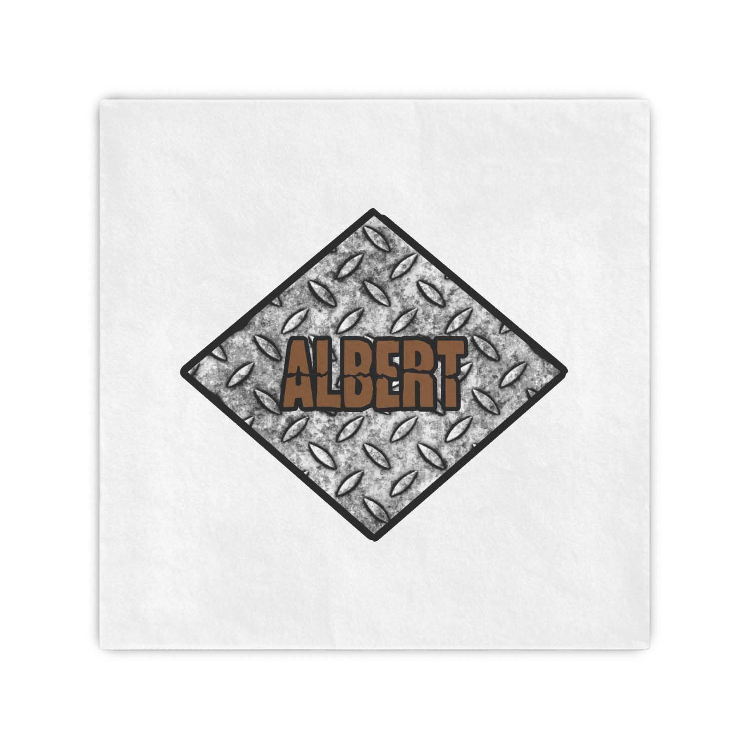 The design idea features a grungy diamond plate as the background. A diamond frame is the focal point of this design idea with your personalization in a grungy font. Nothing could get more manly than this.