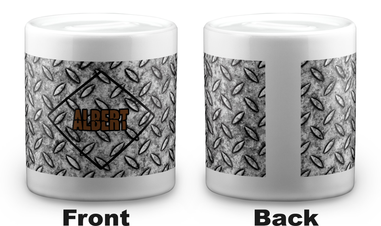 The design idea features a grungy diamond plate as the background. A diamond frame is the focal point of this design idea with your personalization in a grungy font. Nothing could get more manly than this.