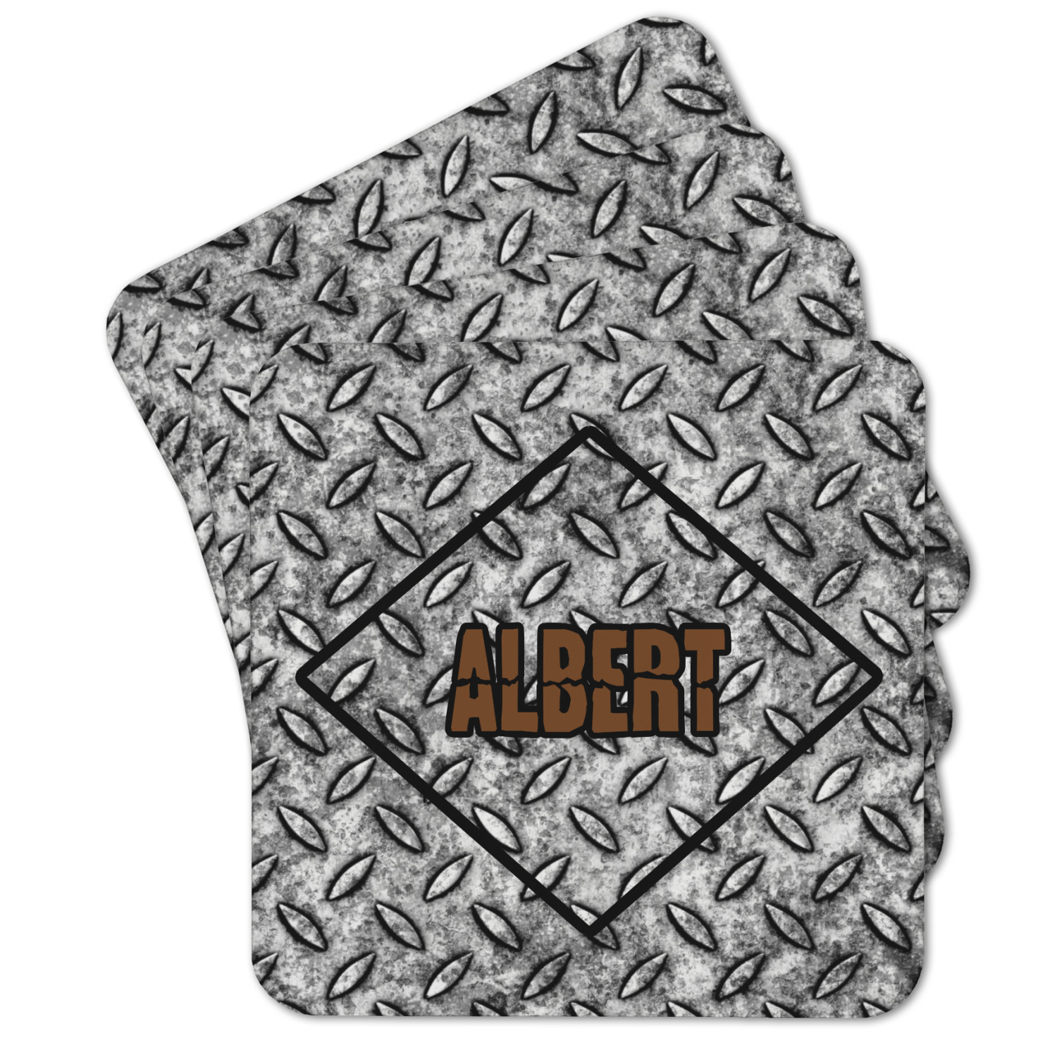 The design idea features a grungy diamond plate as the background. A diamond frame is the focal point of this design idea with your personalization in a grungy font. Nothing could get more manly than this.