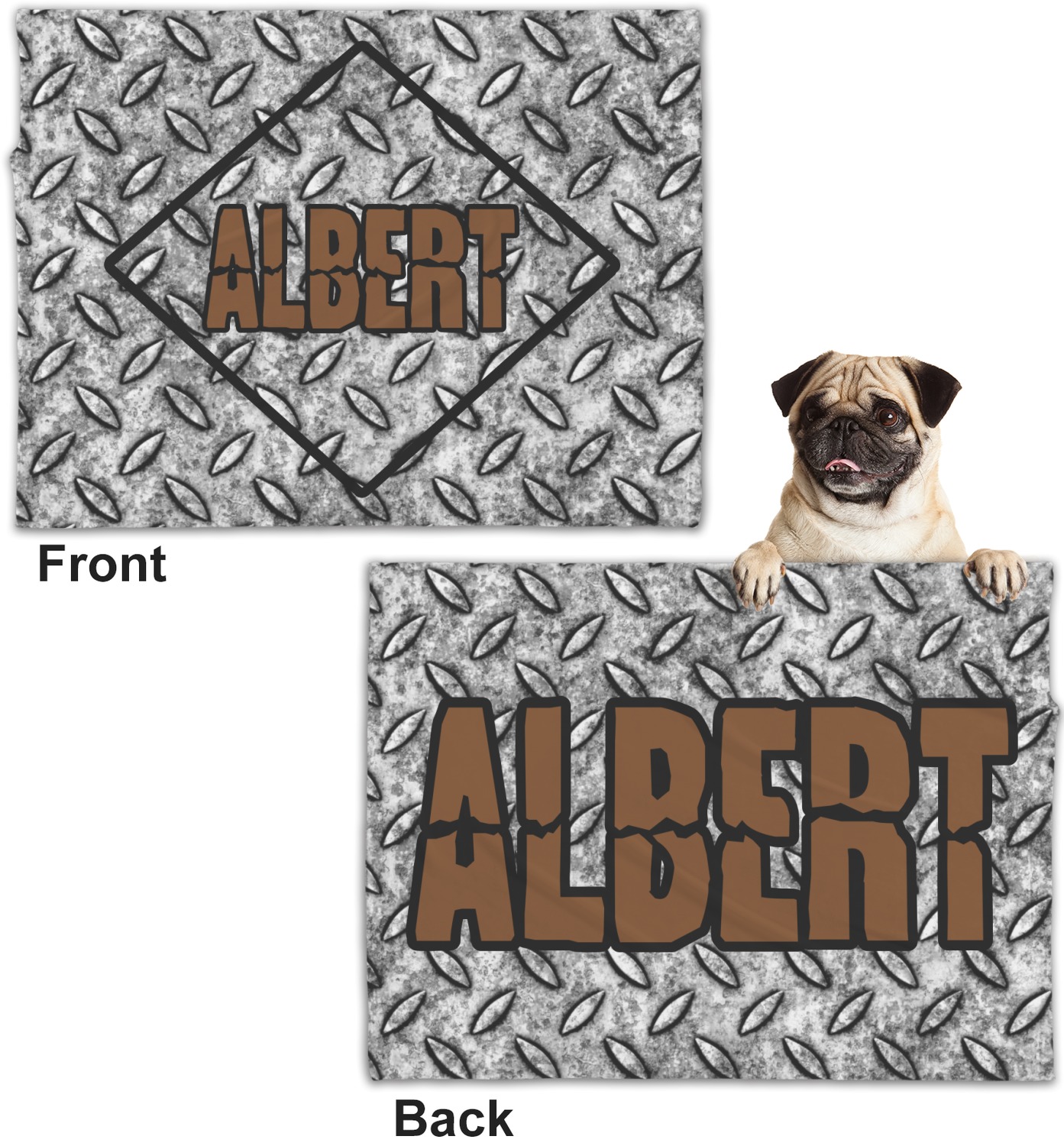 These dog blankets are crafted from a gentle, soft-to-the-touch, minky material. We print your customizations, either matching or differing, on both the top and underside of the blanket. These personalized dog blankets are available in two sizes: regular and large. Our regular size, at 40" x 30", accommodates small and some medium size dogs. At 60" x 50", our large dog blanket is a better fit for bigger breeds. Though specialized for dogs, these blankets still make a thoughtful gift for your favorite feline, or any other pet in mind!