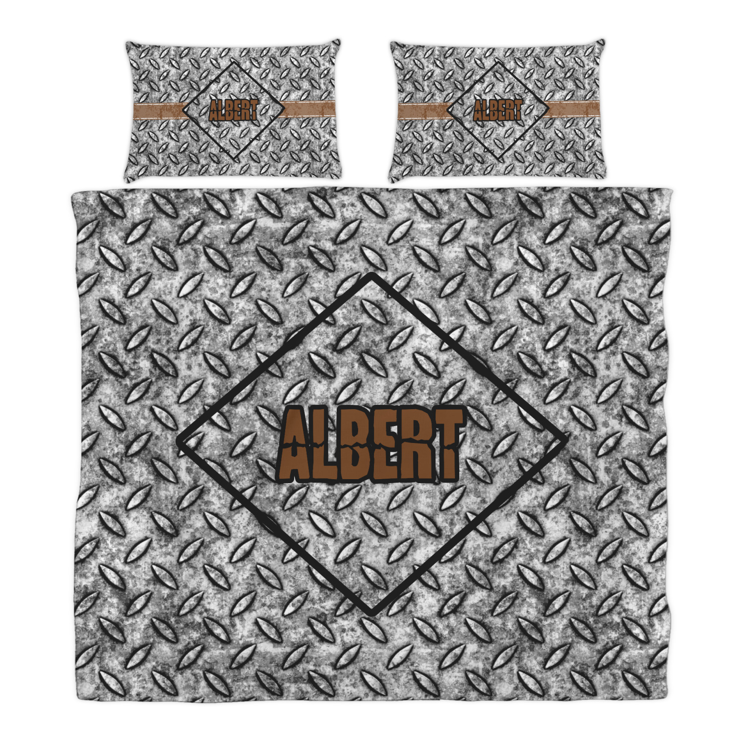 The design idea features a grungy diamond plate as the background. A diamond frame is the focal point of this design idea with your personalization in a grungy font. Nothing could get more manly than this.