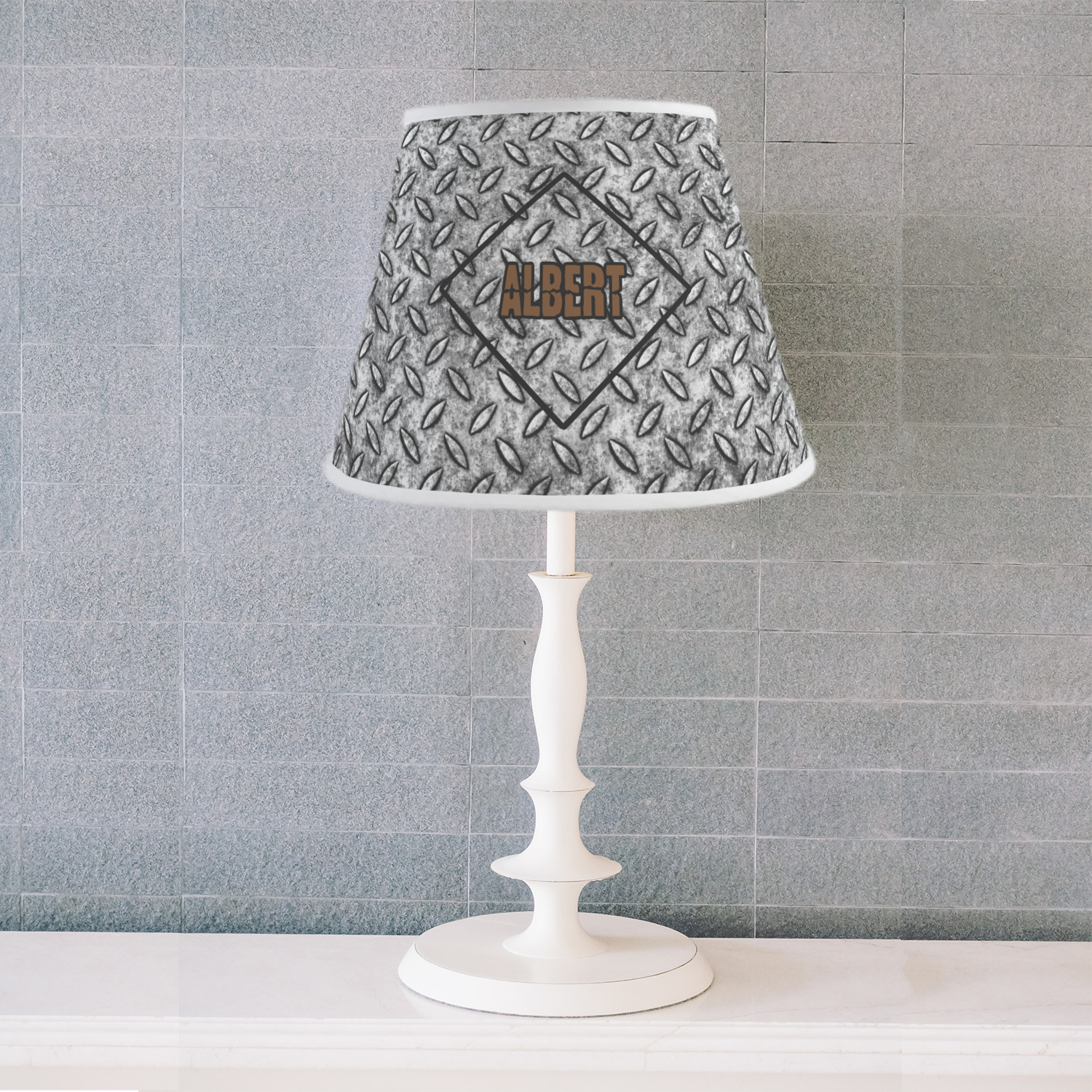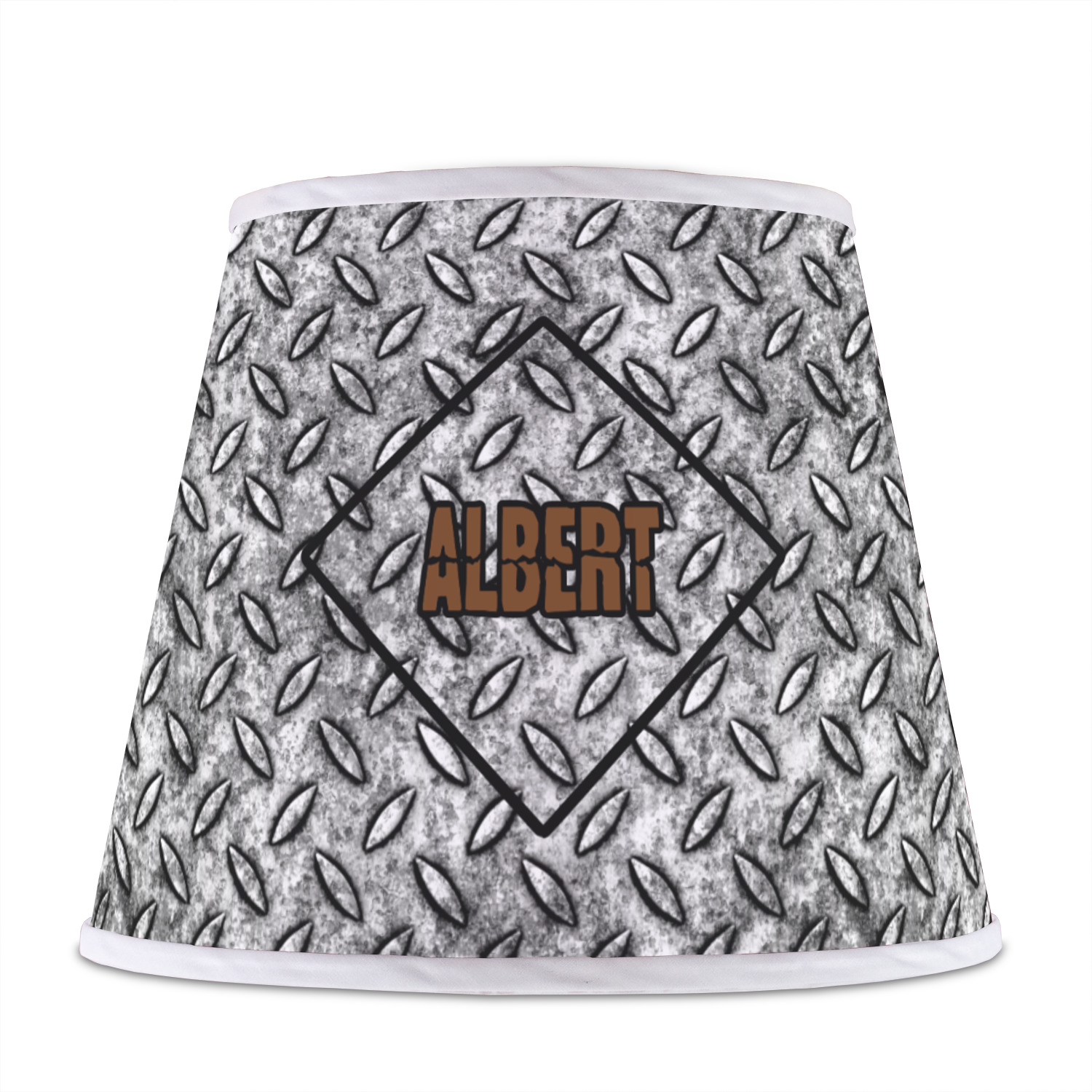 The base of this lampshade is 12 inches in diameter, and the top spans 8 inches in diameter. The total height of the lampshade is 10 inches. The angled nature of this custom lampshade concentrates the light, making it ideal for smaller spaces. This lampshade is made of matte, polyfilm, and displays your customization in its middle. The top and bottom of this colorful lamp shade are lined with a white fabric ribbon (which can be replaced with black inside the design studio) which frames your design and creates a sophisticated finish. As an UNO fitter lampshade, this unique lamp shade will fit a variety of bases.