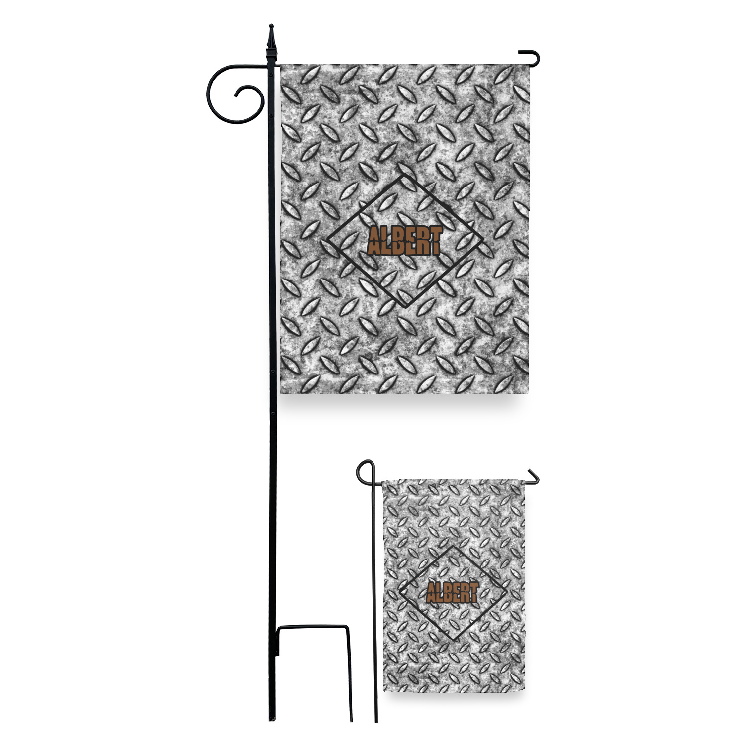 These custom garden flags are made of a durable, double-ply, polyester weave, allowing them to withstand the elements year round. The small flags measure at approximately 12 by 18 inches. The large flags measure out to 28 by 37 inches. You can order these decorative flags with your customization printed on the front only, or the front and back.