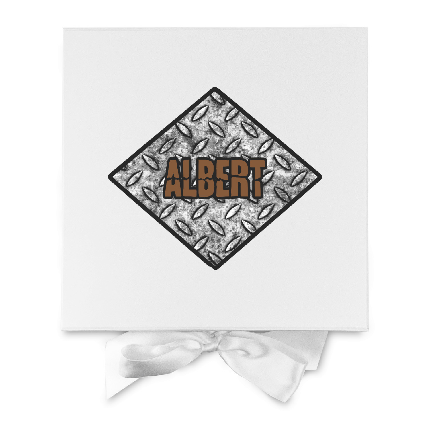 The design idea features a grungy diamond plate as the background. A diamond frame is the focal point of this design idea with your personalization in a grungy font. Nothing could get more manly than this.