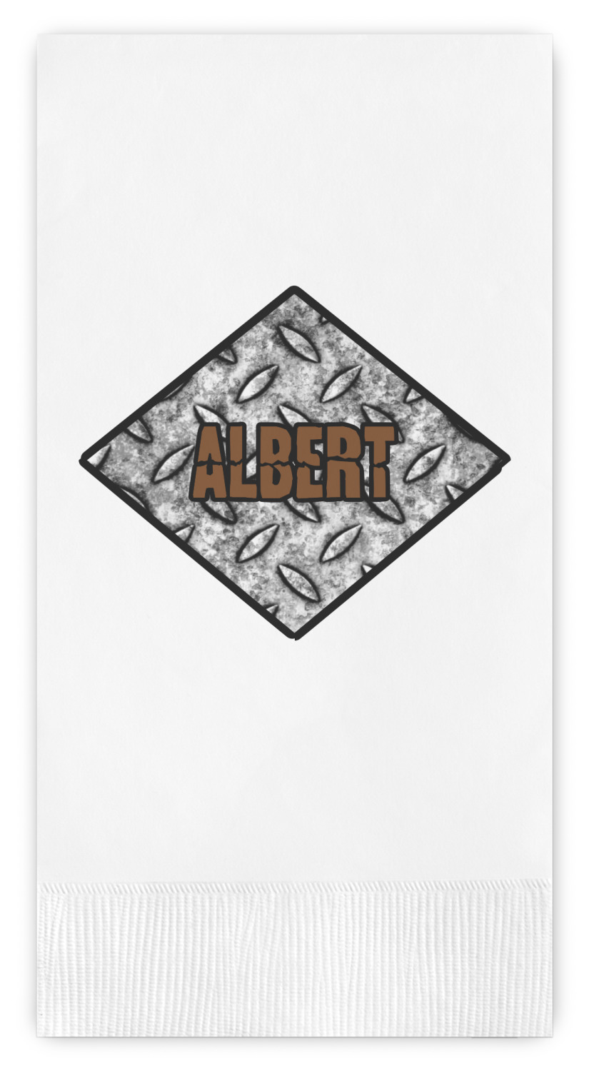 The design idea features a grungy diamond plate as the background. A diamond frame is the focal point of this design idea with your personalization in a grungy font. Nothing could get more manly than this.