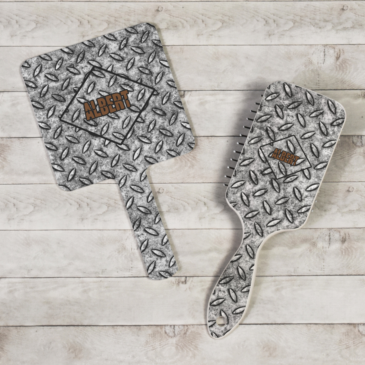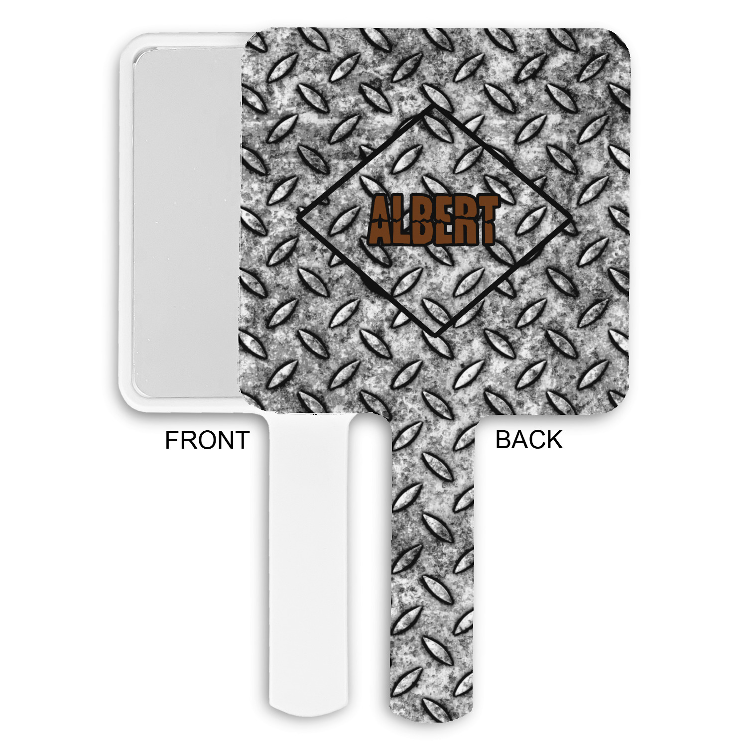 The design idea features a grungy diamond plate as the background. A diamond frame is the focal point of this design idea with your personalization in a grungy font. Nothing could get more manly than this.