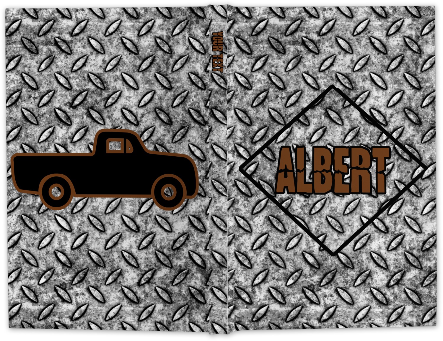 The design idea features a grungy diamond plate as the background. A diamond frame is the focal point of this design idea with your personalization in a grungy font. Nothing could get more manly than this.