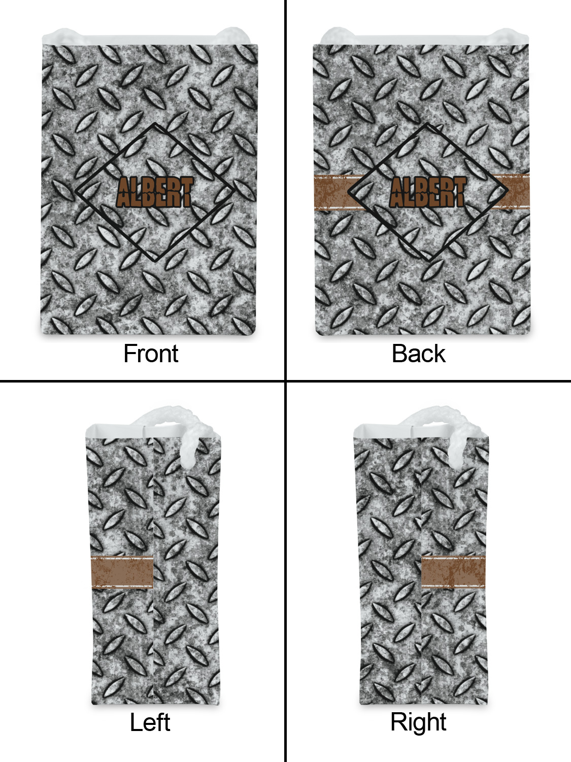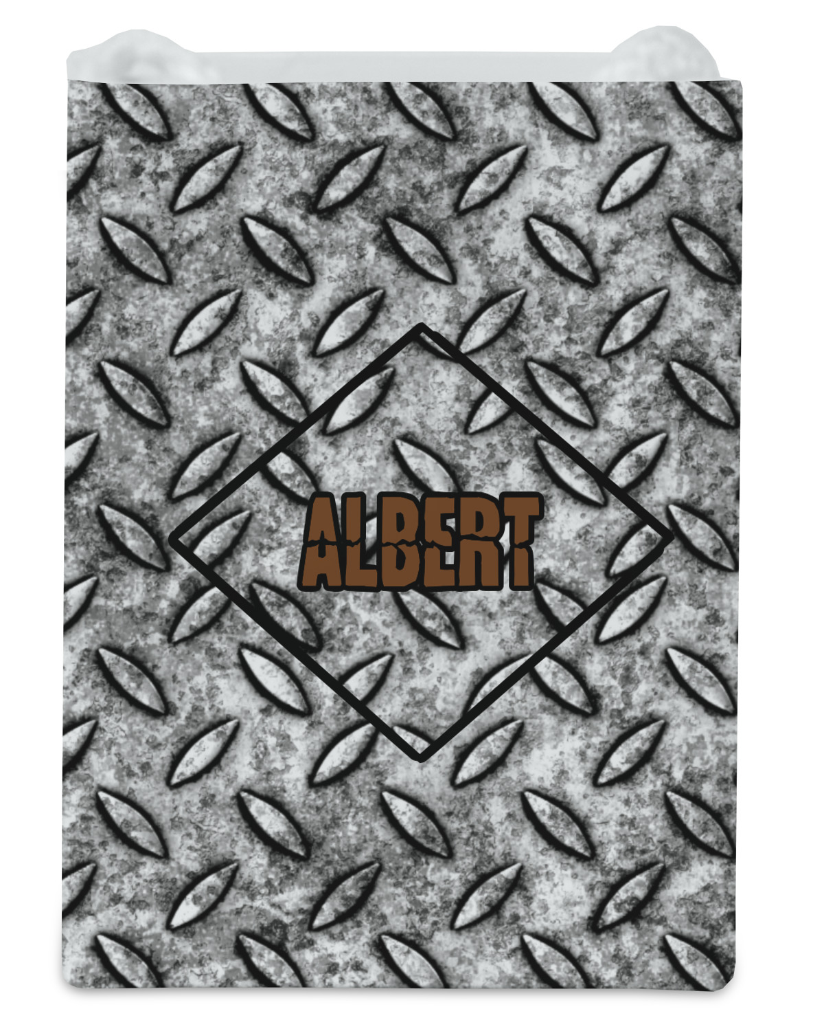 The design idea features a grungy diamond plate as the background. A diamond frame is the focal point of this design idea with your personalization in a grungy font. Nothing could get more manly than this.