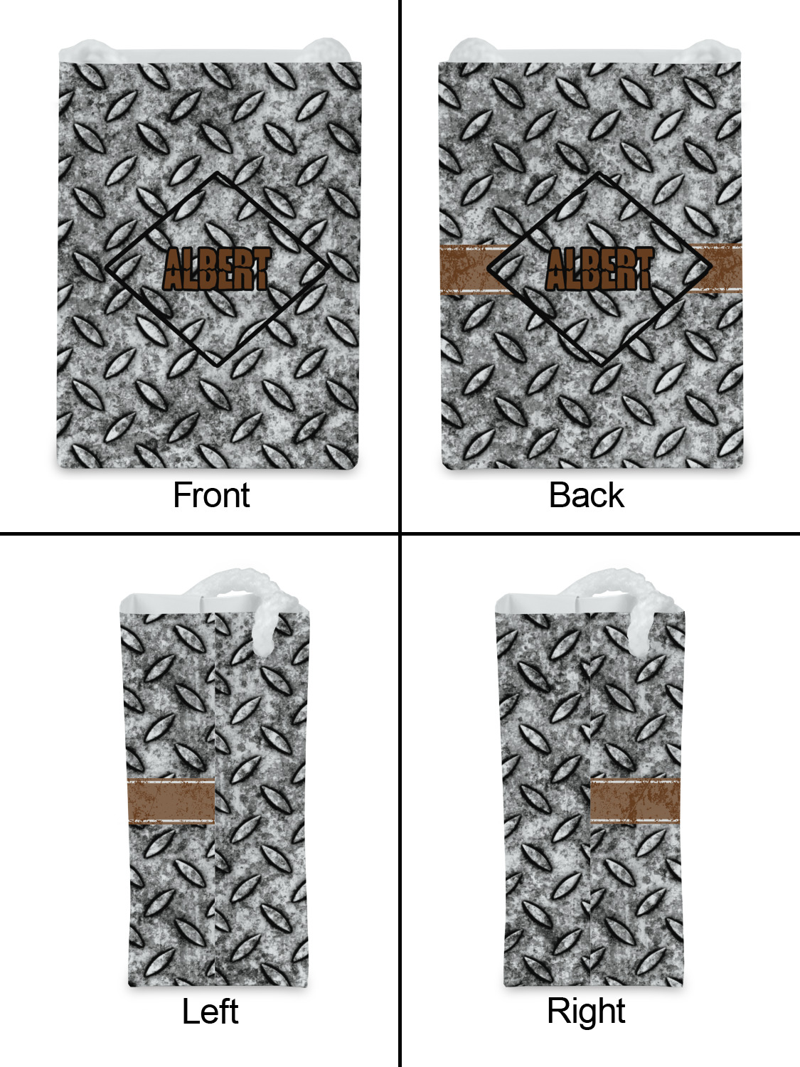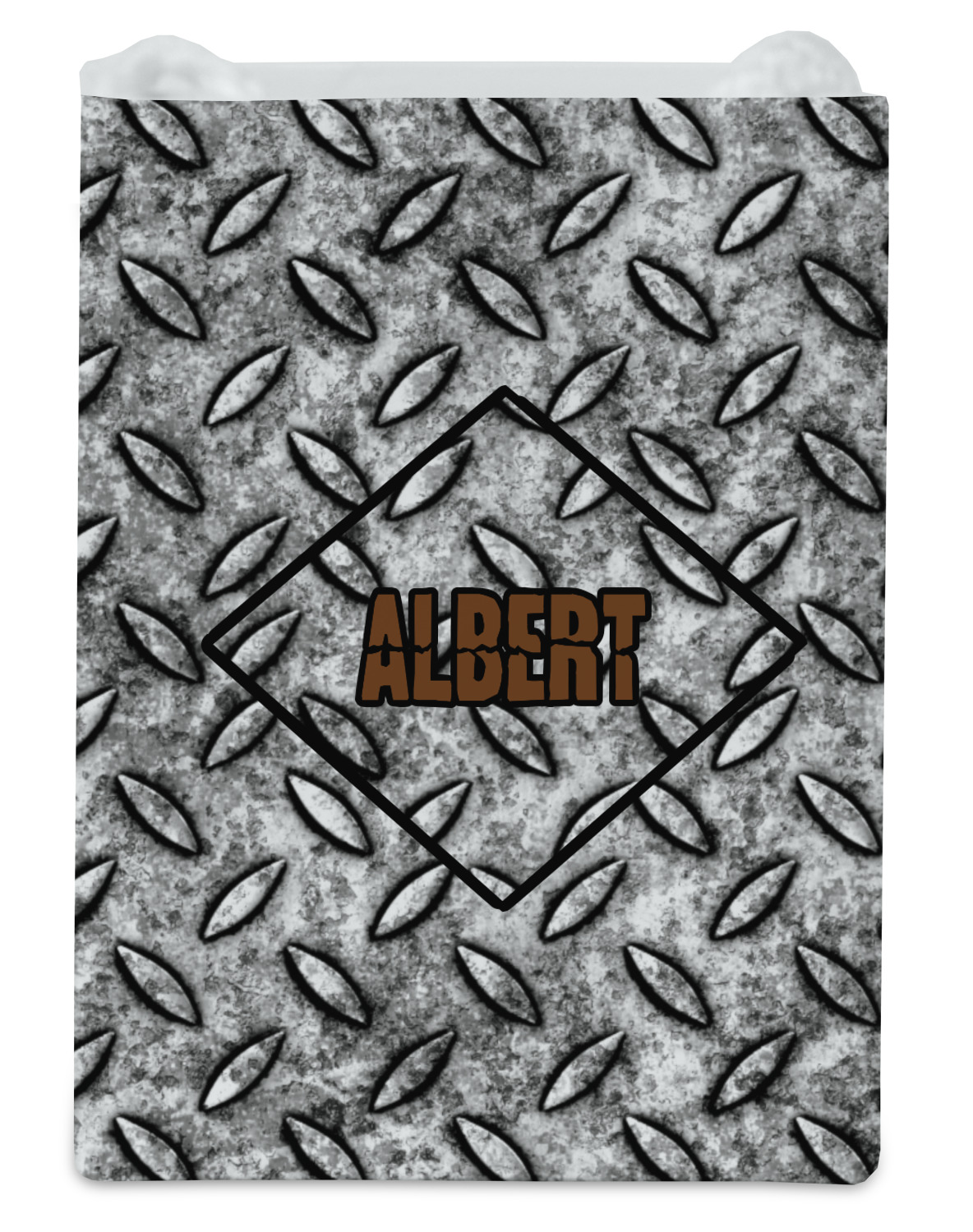The design idea features a grungy diamond plate as the background. A diamond frame is the focal point of this design idea with your personalization in a grungy font. Nothing could get more manly than this.