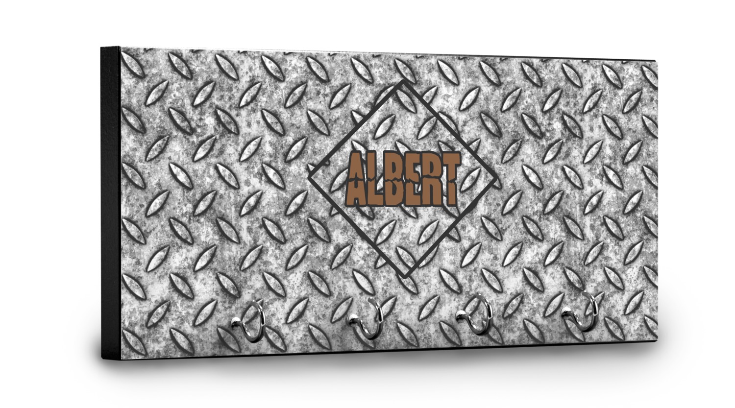 The design idea features a grungy diamond plate as the background. A diamond frame is the focal point of this design idea with your personalization in a grungy font. Nothing could get more manly than this.