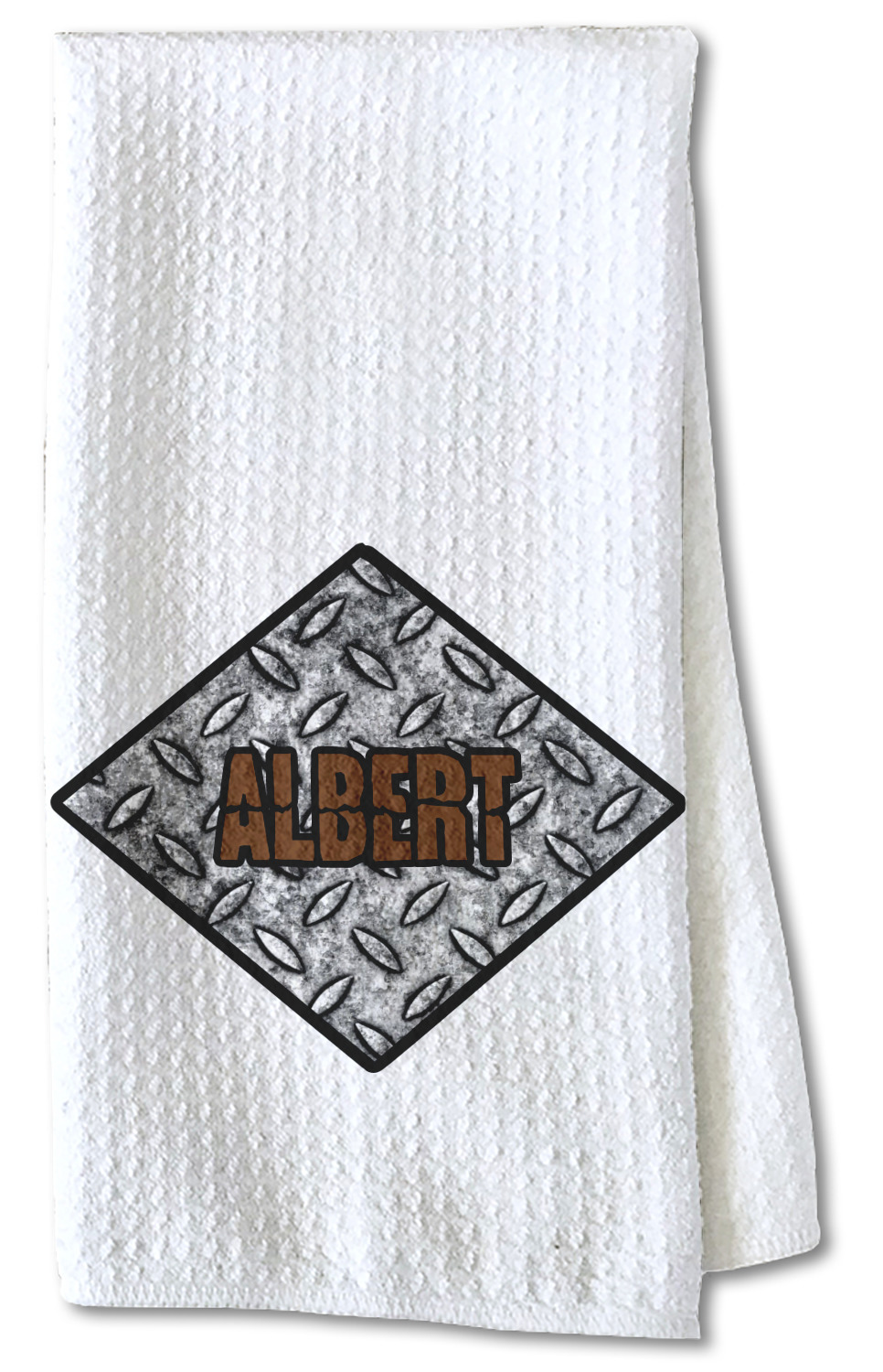 The design idea features a grungy diamond plate as the background. A diamond frame is the focal point of this design idea with your personalization in a grungy font. Nothing could get more manly than this.